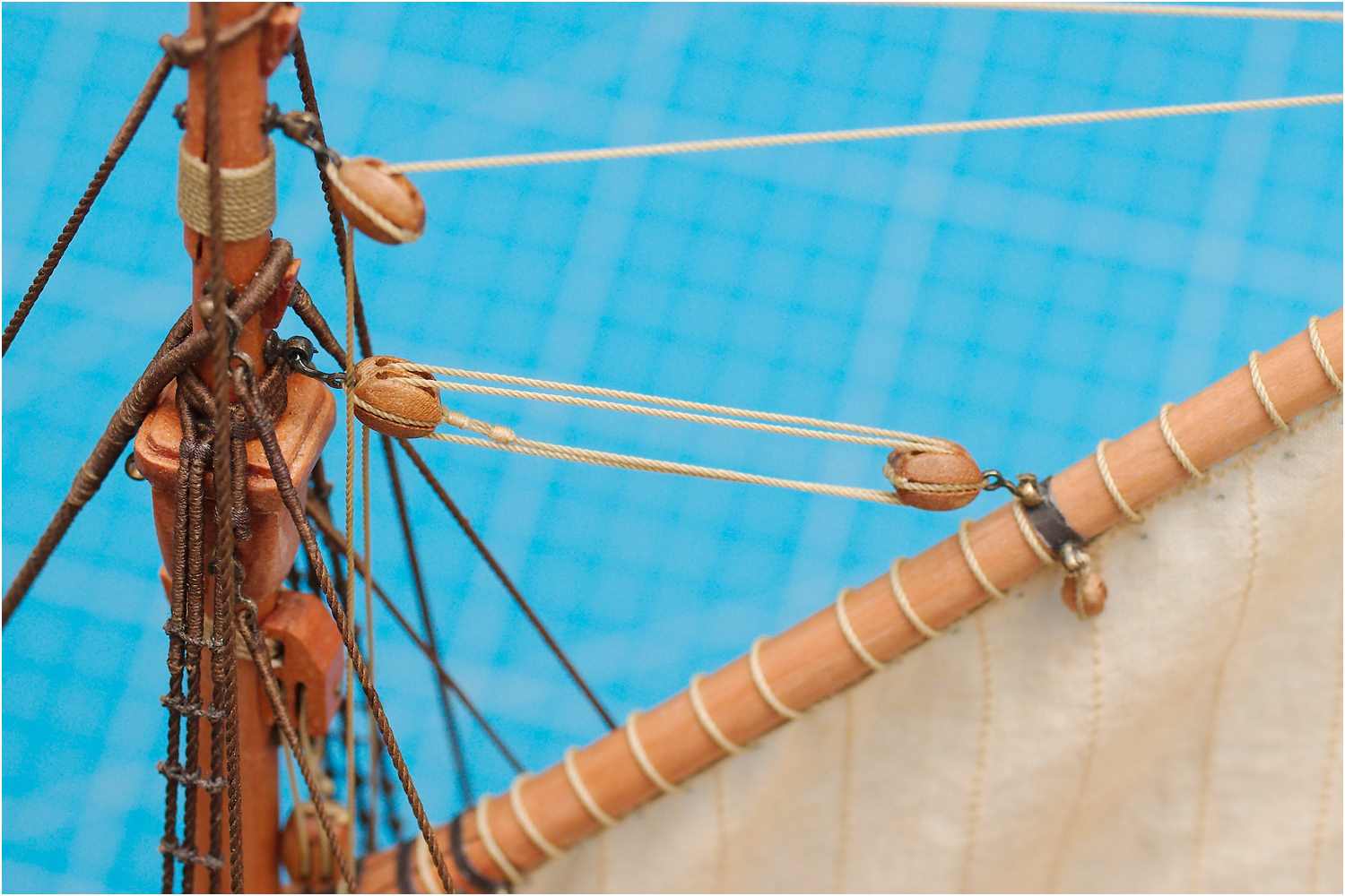 Q: 194 (226) 1 x Violine (7 mm), 1 x E-Block (5 mm) einfaches Perlenrack, wird dichtgeholt mit am Mastfuß eingehakter Talje belegt an Klampe am Mastfuß unter der Talje Garn: Niederholer 3x5 Skala 240, Läufer 3x3 Skala 240 |
