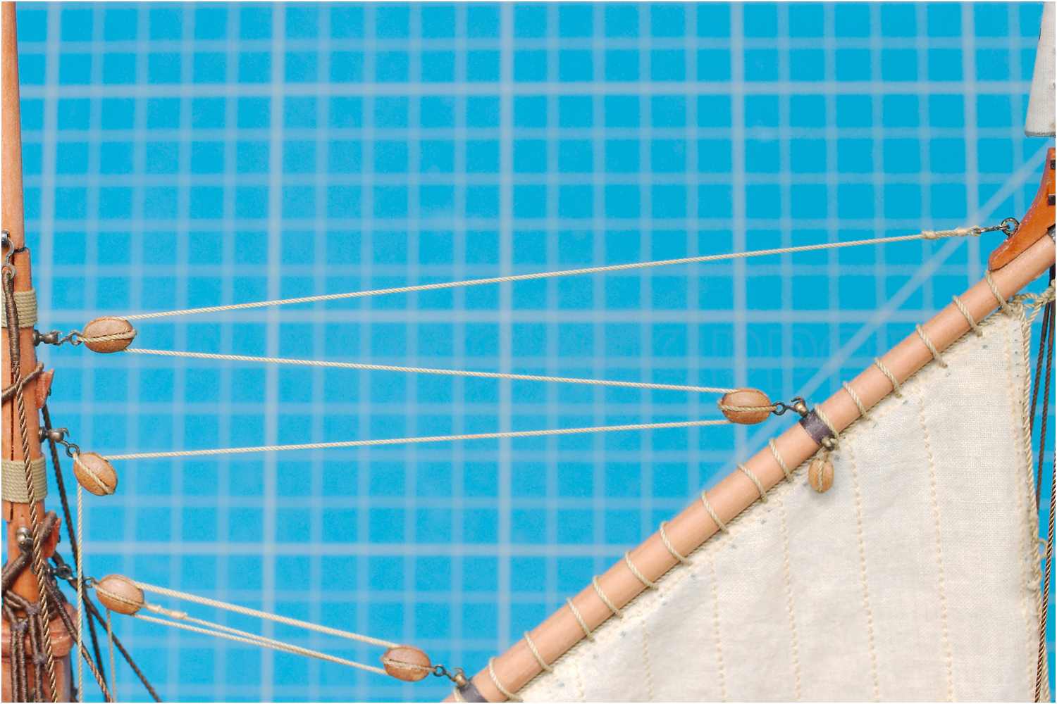 Q: 195 (228) stehende Part an der Topprahnock, laufen zu Leitblöcken auf der stehende Part des Piekfalls, über Leitblöcke an der achteren Want, weiter durch Leitkauschen, belegt am achteren Nagel an den Nagelbänken bei den Wanten Garn: 3x3 Tera 420 |