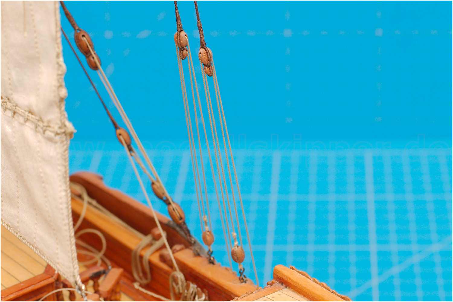 Q: 194 (225), korrigiert nach JU 2 x Violine (7 mm), 2 x E-Block (5 mm) Doppelschenkel zusammen mit [12], eingehakt am Gaffelnockbeschlag, Verhältnis Schenkel zum Läufer 3:1, unterer Block der Taljen eingehakt in den Püttings am Setzbord, laufende Part läuft durch ein Loch im Schanzkleid siehe NJ 195 (225) belegt links und rechts an der vierten Klampe Innenseite Setzbord, hinter der vorderen Geere [12] Garn: Schenkel 3x6 Skala 200, Läufer 3x2 Skala 200 |