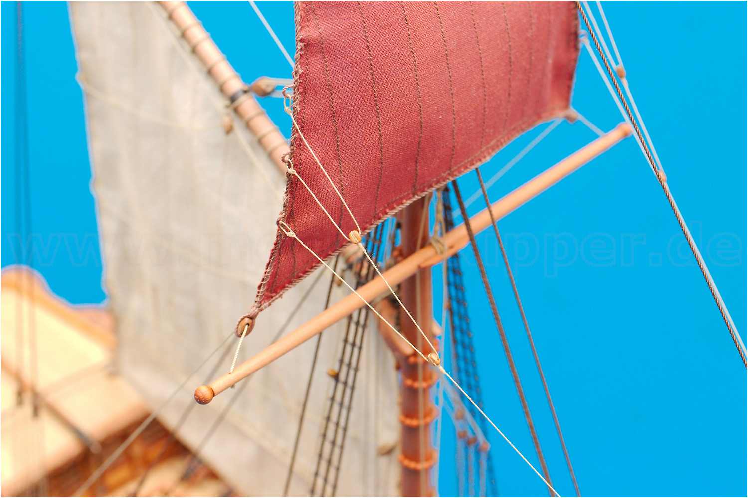 Q: 197 (234 ff) oberes Liek mit Marlschlag an der Gaffel angeschlagen, Legel am Vorliek mit Rackbändsel als Variante mit Reihleine und Klotjes Garn: 3x3 Alterfil 180 |