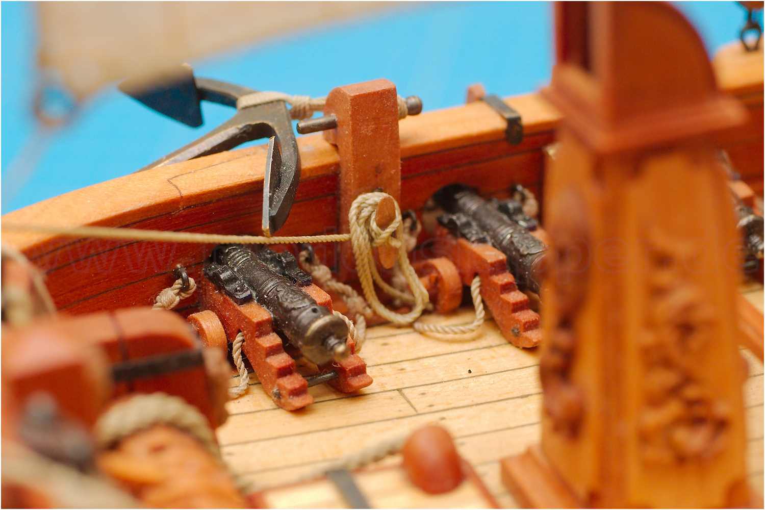 Q: 189 (214, 220) 1 x E-Block (7 mm) loses Auge, bekleidet, liegt über der Tonne der Stenge, läuft über Leitblock am Bugsprietknie, belegt an inneren Bb-Nagel der Spillbeting Garn: 3x5 Alterfil 180 |