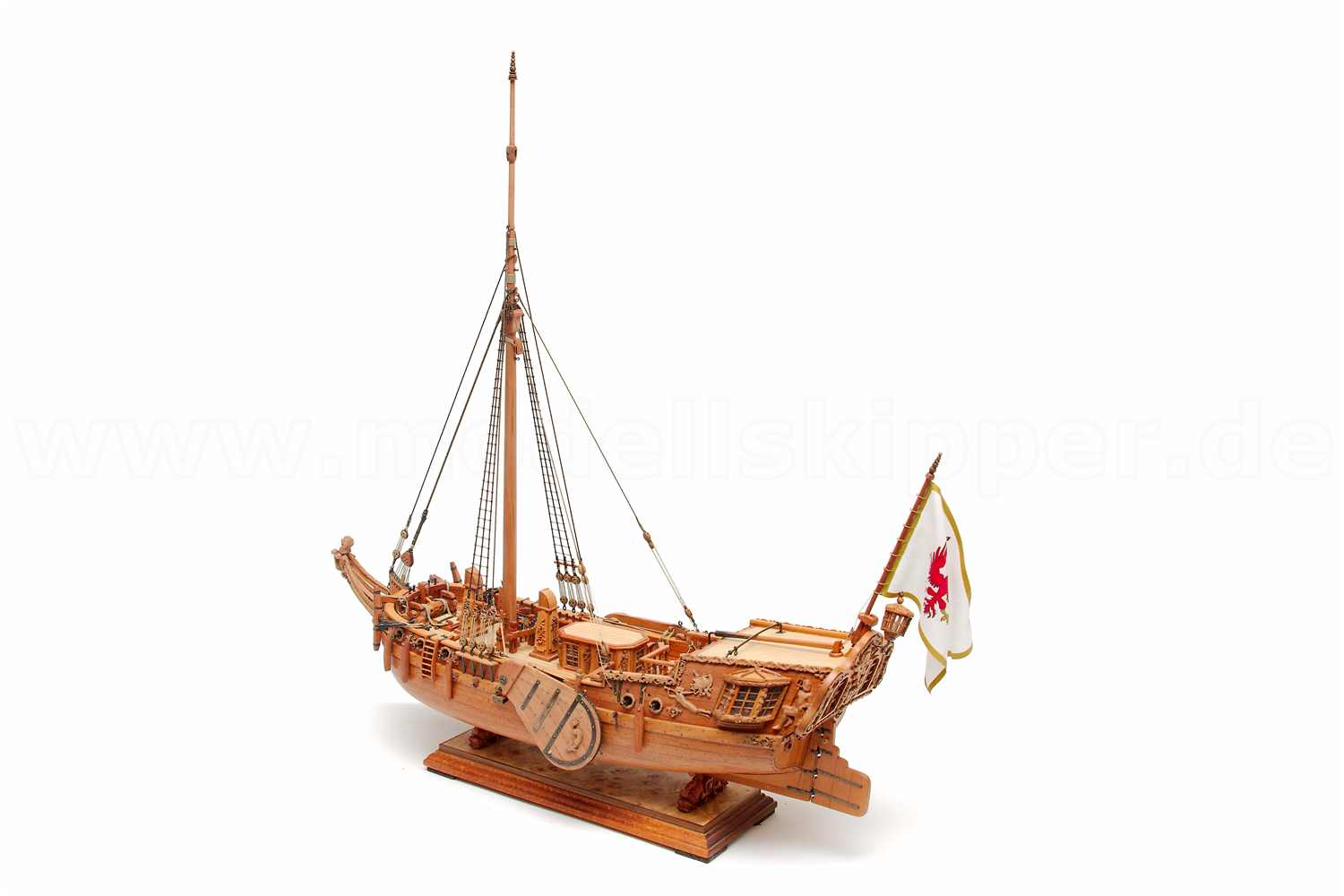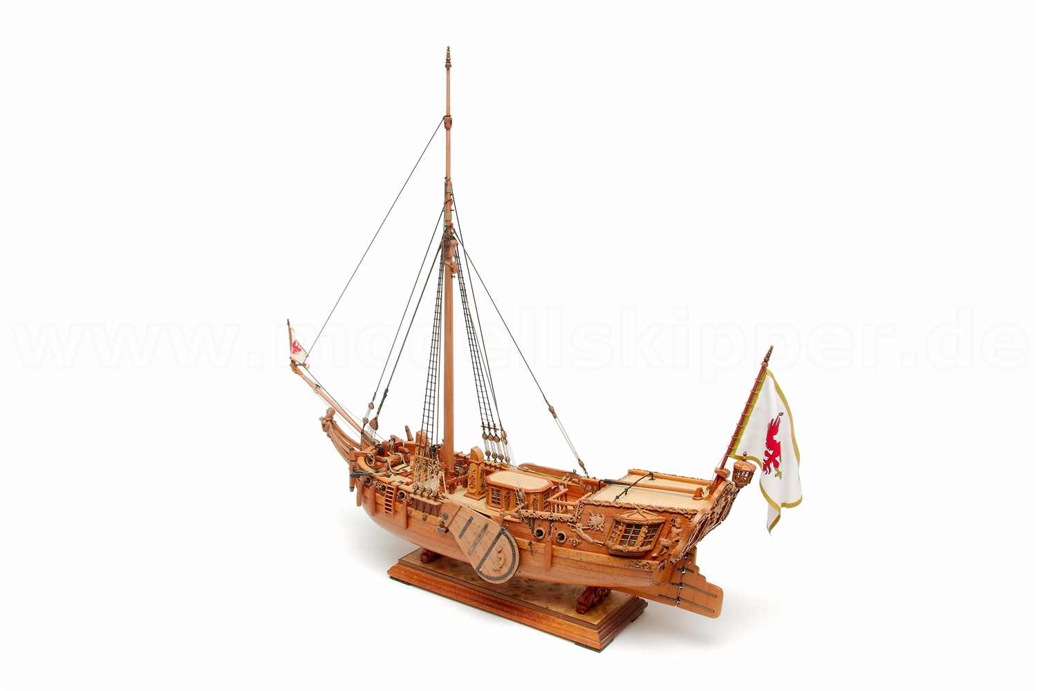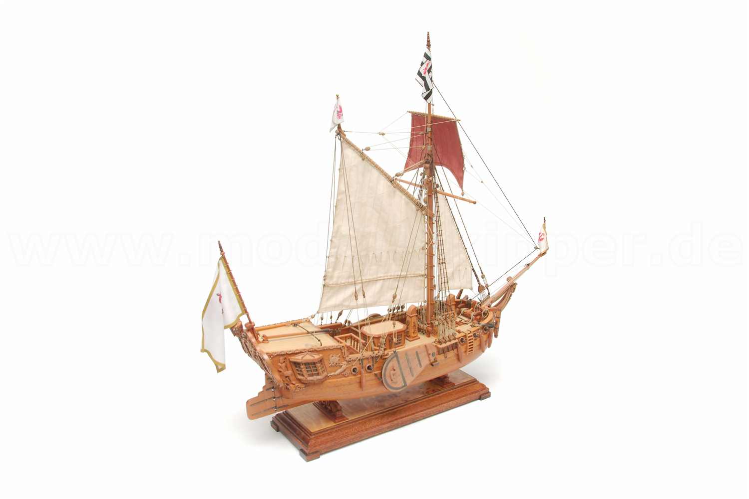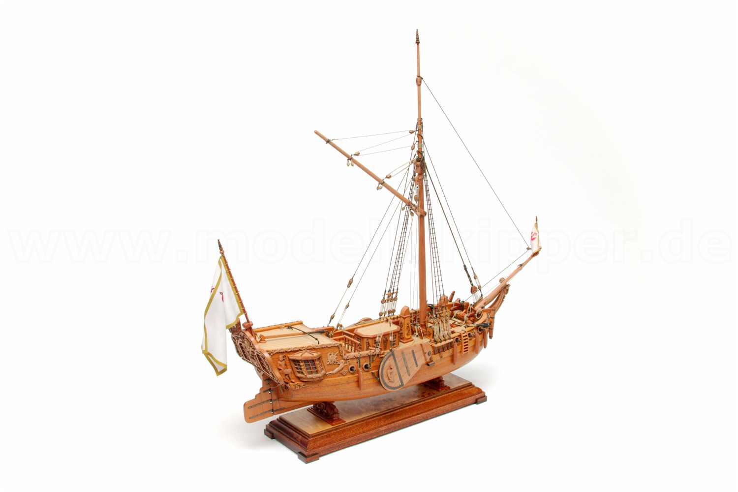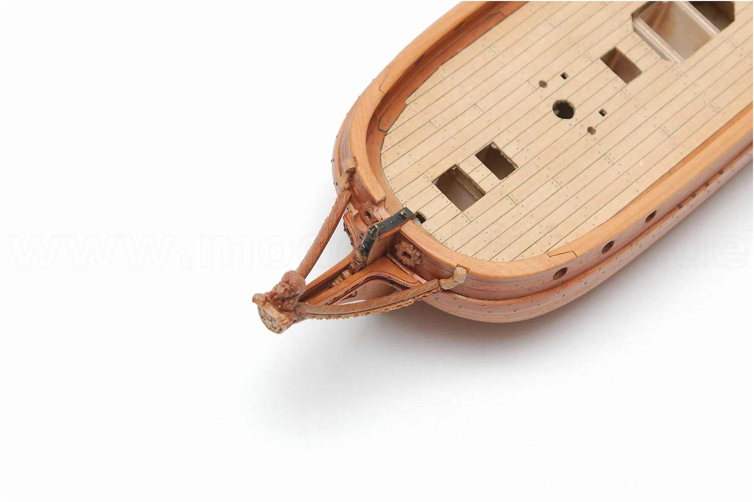 734 Std.: mit Setzen der "großen Flagge ", einem neuen Ständerbrettchen, fertigen Kanonen und Laterne sind die Detailarbeiten am Rumpf abgeschlossen