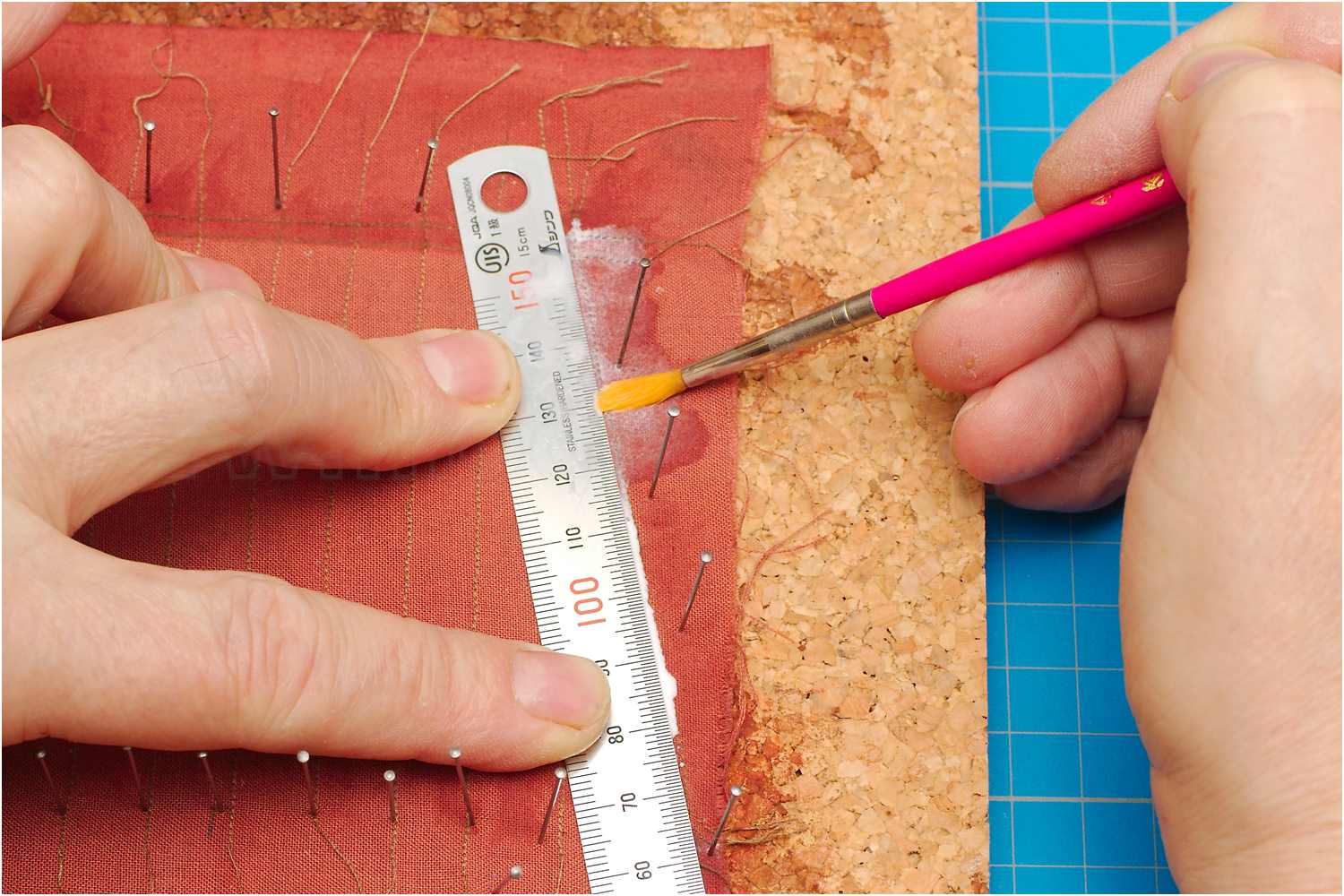 Mit Hilfe eines Stahllineals und einer Einwegspritze, in die ich verdünnten Holzleim gefüllt habe, versiegle ich die Außenkanten des Segels, sodass sie nicht ausfransen können.