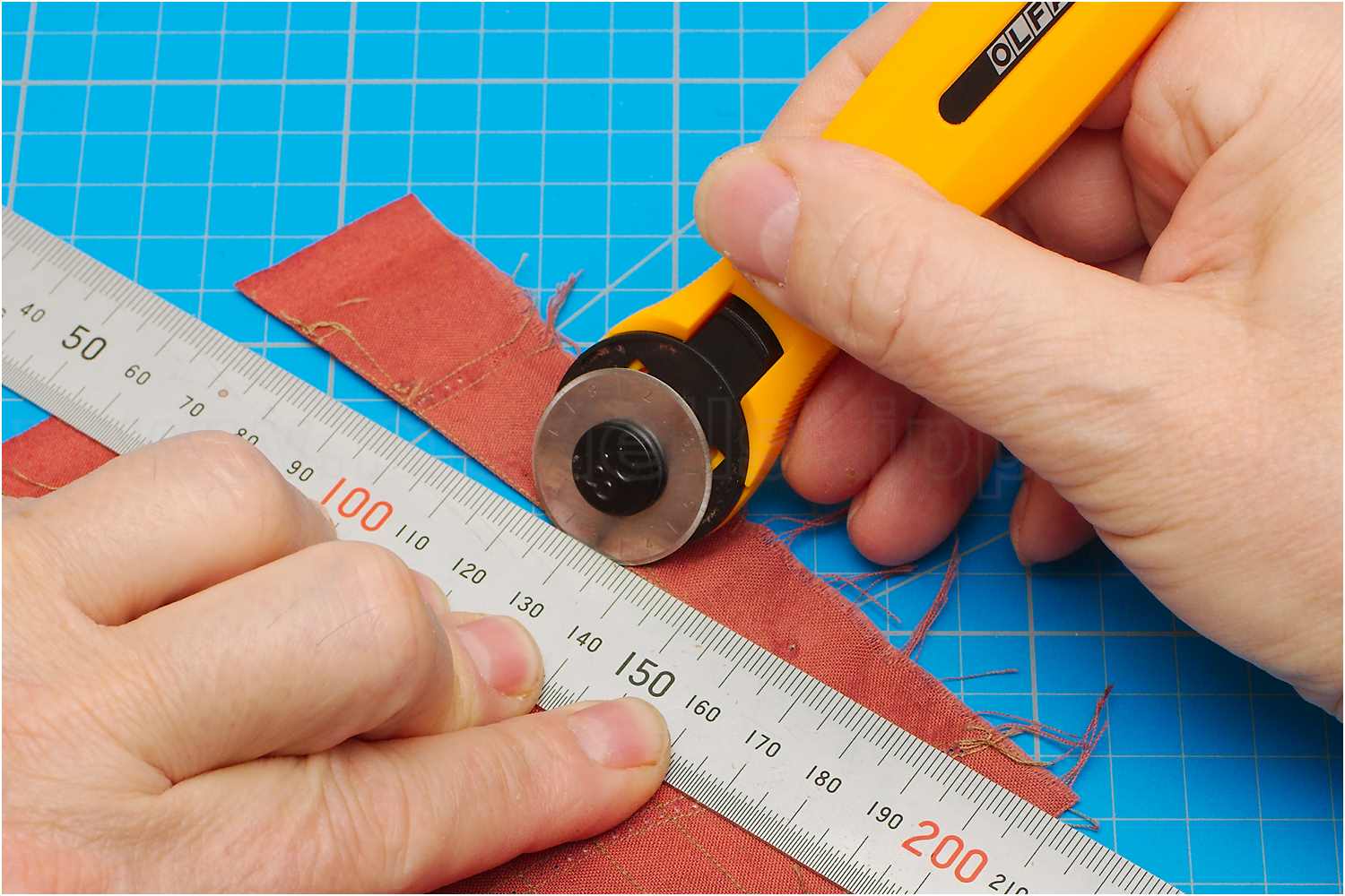 Abschließend schneide ich den überschüssigen Stoff mit einem Rollschneider an der Liekkante des Segels ab.
