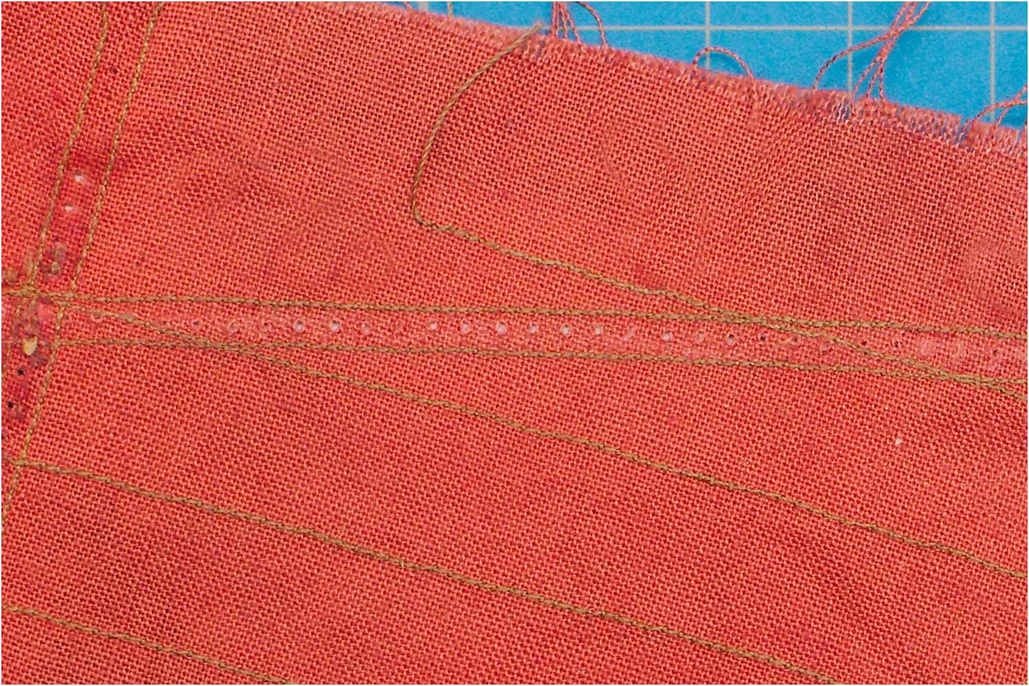 Ist der Kleber getrocknet, lasse ich den Saum noch einmal durch die Nähmaschine ohne eingezogenen Faden laufen. So wird der Stoff perforiert, die Löcher liegen sauber in einer Flucht und sorgen für einen gleichmäßigen Abstand beim Annähen des Liektaus.