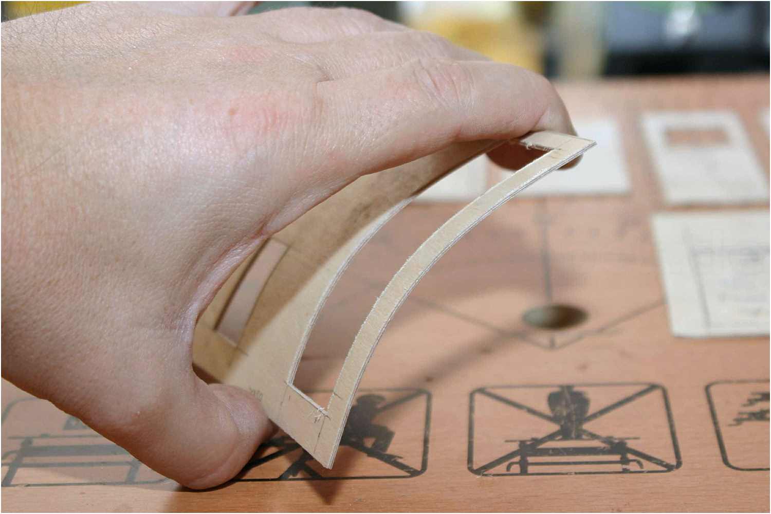 Beim Zuschneiden dünner Sperrholzteile für Aufbauten, die später mit Holzleisten beplankt werden, sollte auf den Faserverlauf der Sperrholzplatte geachtet werden.