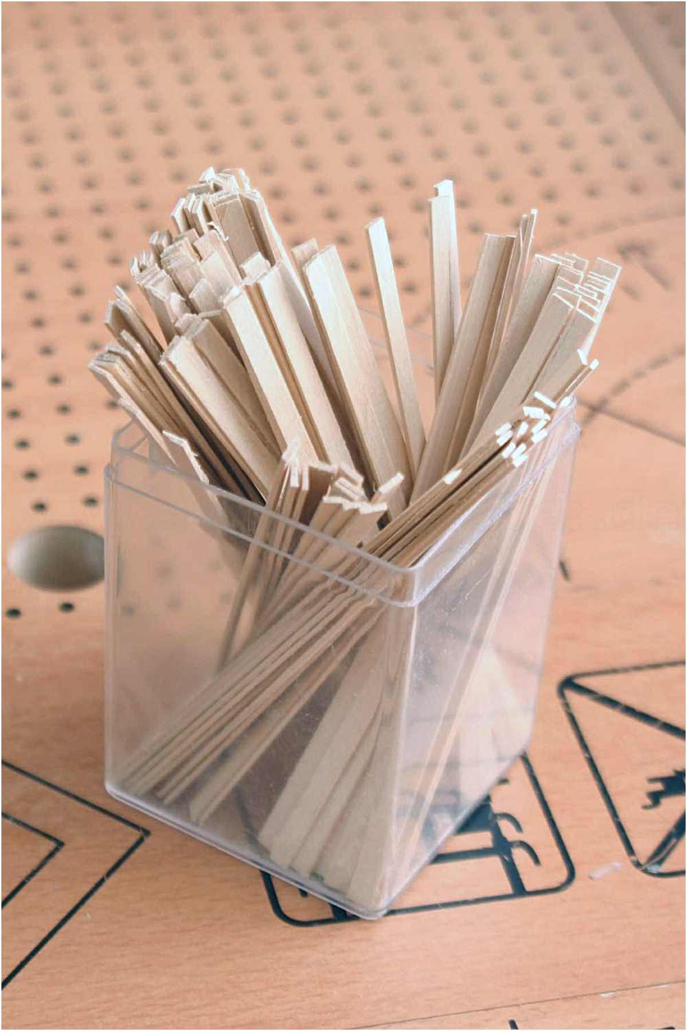 Es empfiehlt sich, die Leisten während der Beplankung in solch einen Behälter zu packen und vor der Benutzung ''zu mischen''. Das garantiert eine zufällige ''Entnahme''. So erreicht man eine hohe Realitätsnähe, wenn Leisten mit unterschiedlicher Struktur nebeneinander aufgebracht werden.