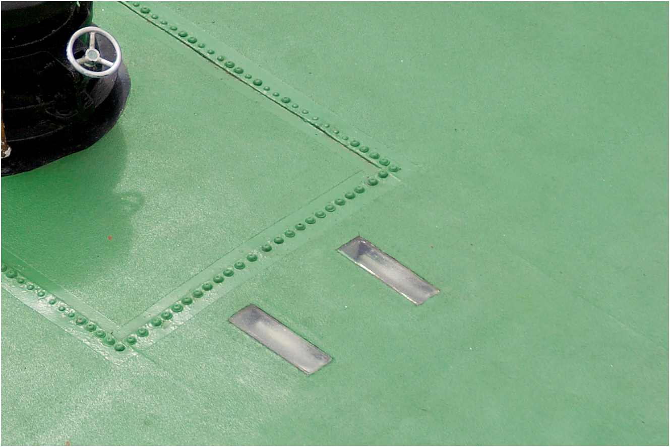 Dieses Detail ist auf Schiffen sehr verbreitet, aber an Modellen ist es fast nie zu sehen - fest in das Deck eingelassene Glasprismen oder runde Kegel, auch Decksgläser oder Deckslichter genannt. Prismengläser werden genutzt, um das einfallende Tageslicht unter Deck besser verteilen zu können.