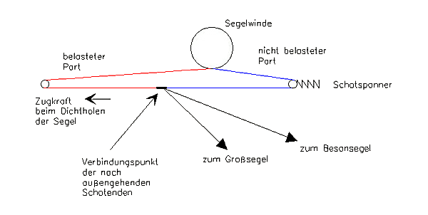 Wichtig wäre noch zu bemerken, dass der Schotspanner für die Segel mit Baum, wie z.B. das Großsegel, auf der Seite des nicht belasteten Parts und nicht auf der Seite des belasteten Parts installiert wird, da hier weniger Kräfte wirken. Ein bisschen kompliziert, aber die Skizze veranschaulicht das Problem.