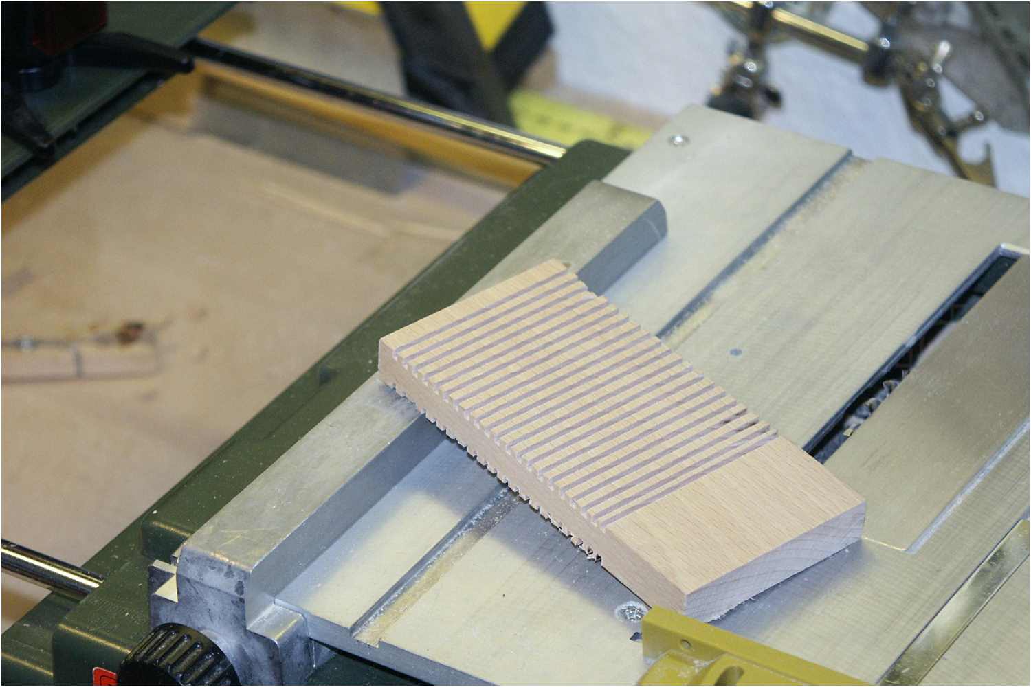 Diese Art der Herstellung geht recht flott voran und das Ergebnis lässt sich durchaus präsentieren. Erhebt allerdings keinen Anspruch auf absolute hochpräzise Genauigkeit. Das Einstellen des Parallelanschlags sollte sehr sorgfältig vorgenommen werden, um einen exakten Abstand der Nuten zu erhalten. Alle Perfektionisten sollten dann doch lieber mit einer Fräse arbeiten.
