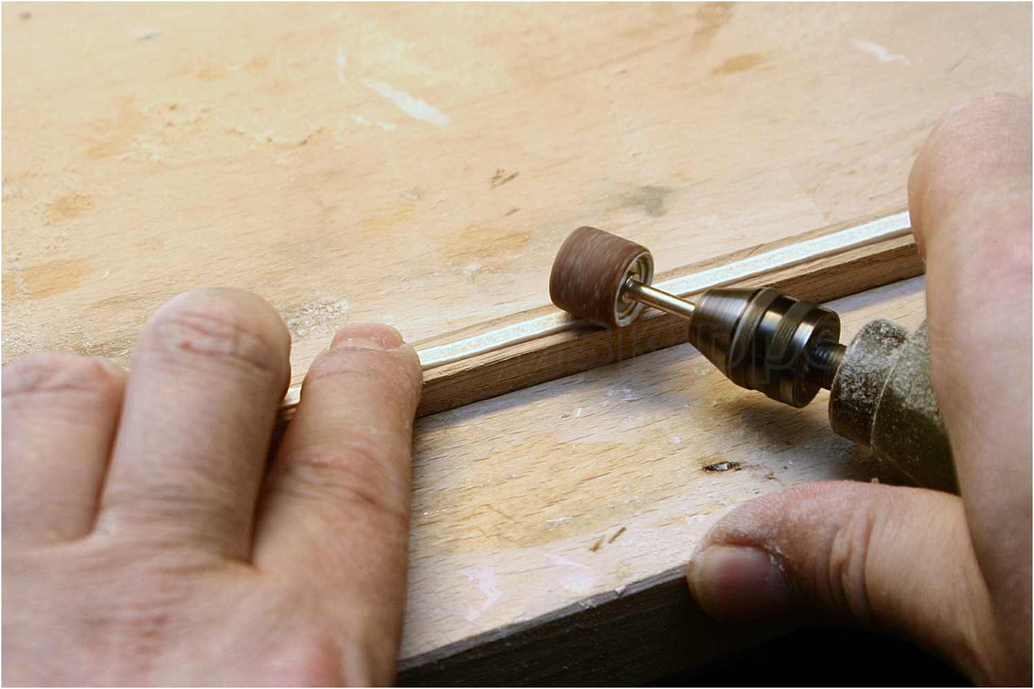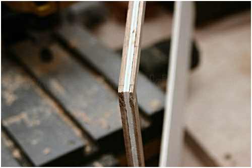 Man beginnt nun mit dem Bodenbalken. Setzt ihn von unten (verkehrt rum) auf den Spant und schleift die Sperrholzschablone ab, damit diese bündig in die Nut passt.