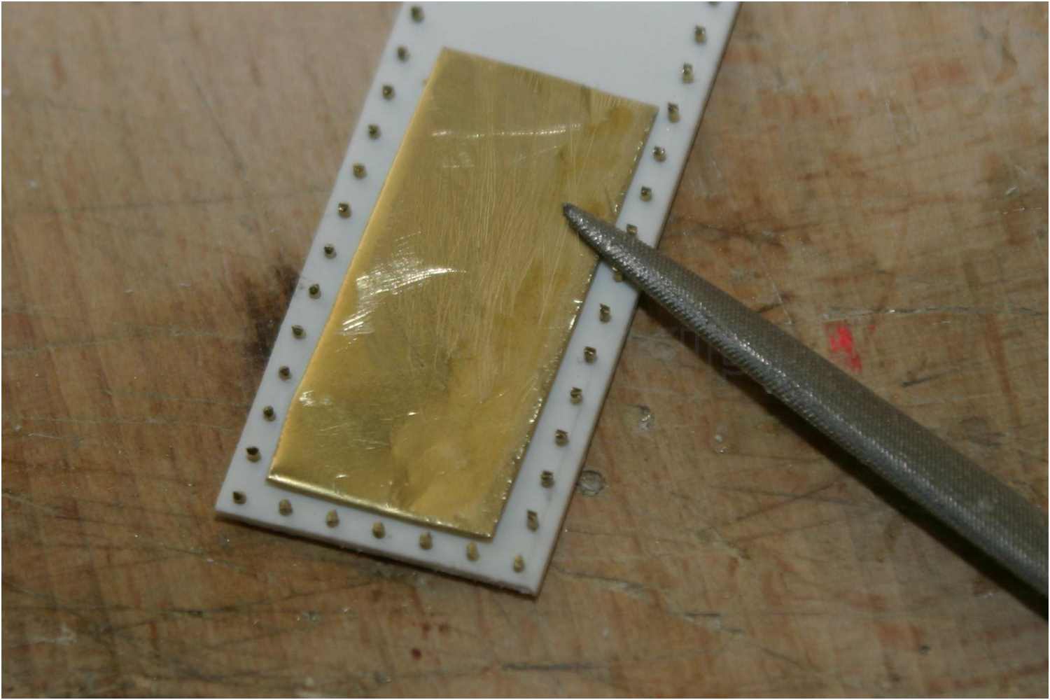 Da hier viele kleine Details auf engstem Raum angebracht werden, machen sich kleinste Abweichungen sofort bemerkbar. Man sollte es bei einer Nietimitation nicht allzu gut meinen, dann lieber weglassen oder auf eine Alternative zurückgreifen. Wer meint, kleine Messing-Rundkopfnägel würden schon gehen, erlebt schnell sein blaues Wunder.