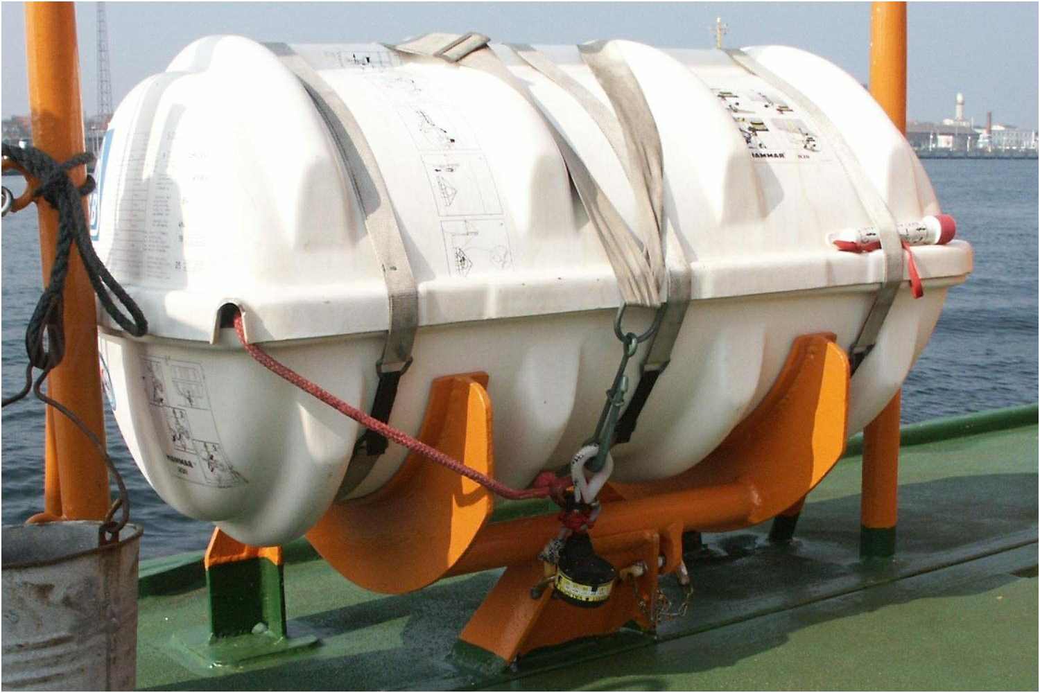 Auf den Bilder ist die Kippeinrichtung des Trägergestells gut zu erkennen, so kann die Rettungsinsel auch per Hand ins Wasser gelassen werden.