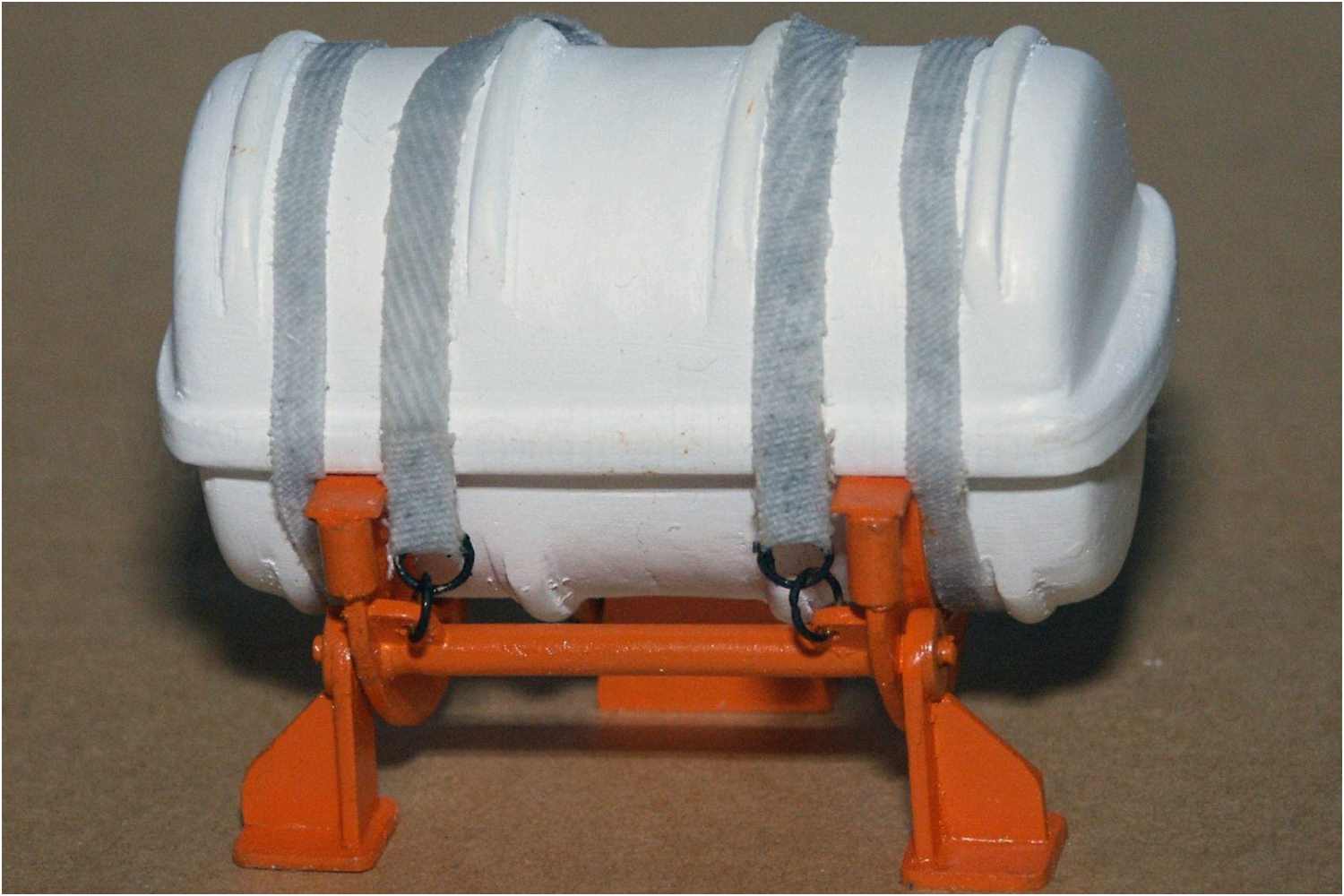 Die fertige Rettungsinsel samt lackiertem Trägergestell, mit Reißleine und Beschriftung.