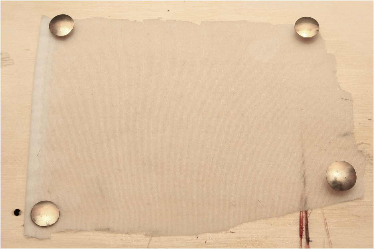 Um das Segeltuch zu imitieren, habe ich ein Stück Stoff auf einem Sperrholzbrettchen mit Reißzwecken fixiert, mit leicht verdünntem Klarlack eingepinselt und über Nacht trocknen lassen.