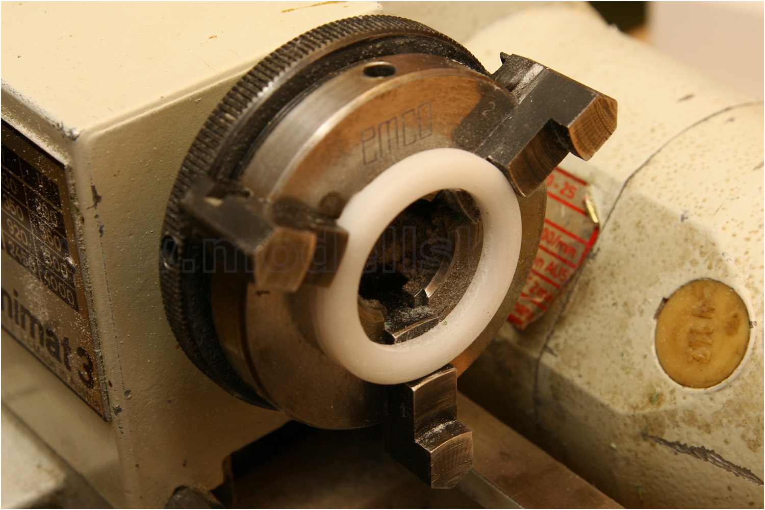 Aus der Materialkiste habe ich mir ein Stück POM herausgesucht. Ein Kunststoff, der sich auf Grund seiner Materialbeschaffenheit sehr gut drehen und schleifen lässt. Selbst auf kleinen, nicht so leistungsstarken Drehmaschinen lässt sich eine "guter" Span abheben, sodass Drehteile recht schnell gefertigt sind.