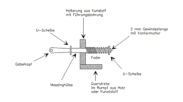 Die Kontermutter am einen Ende der 2 mm Gewindestange wird mit etwas Sekundenkleber fixiert und ist dadurch fast unlösbar. Auf die Gewindestange kommt dann eine Unterlegscheibe, die Messinghülse und darüber der Feder. Das Ganze wird dann in die Halterung auf der Querstrebe eingesetzt. Noch eine U-Scheibe, die verhindert, dass sich der Gabelkopf in der Führung der Halterung verklemmt. Nun alles zusammenschrauben und mit einem kleinen Maulschlüssel mit der Kontermutter festziehen. Darauf achten, dass die Führung in der Halterung einen ausreichenden Durchmesser hat, damit die Messinghülse leicht gleiten kann.