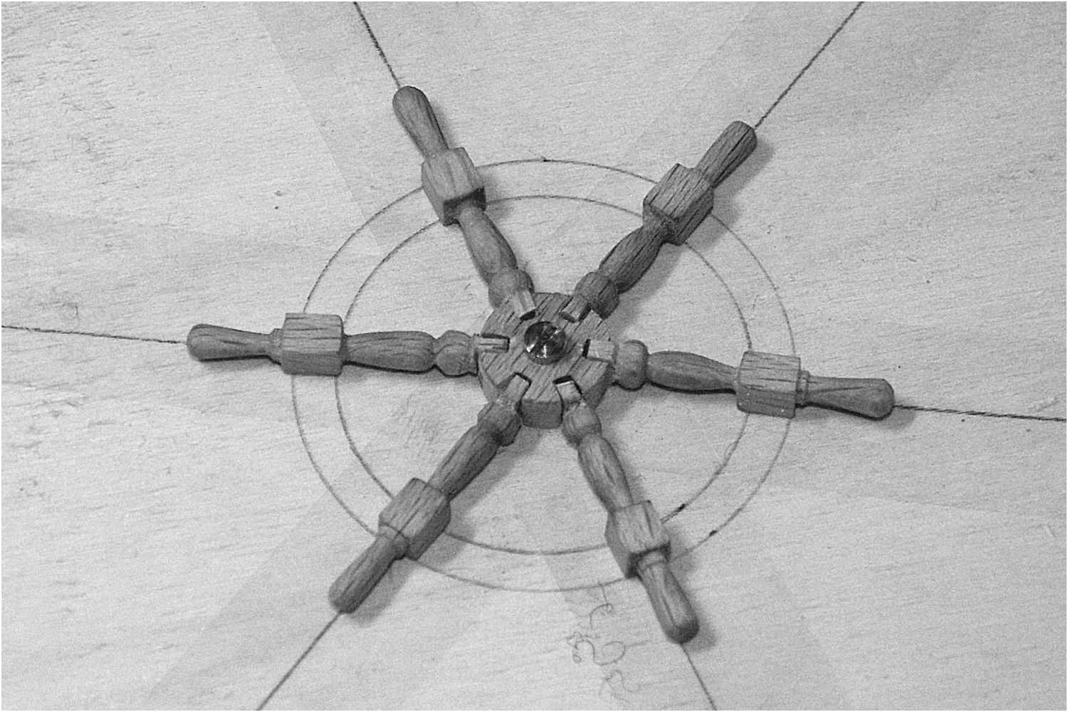 Die Nabe mit Nuten für die Aufnahme der Speichen und die Speichen des Steuerrades sind angefertigt.