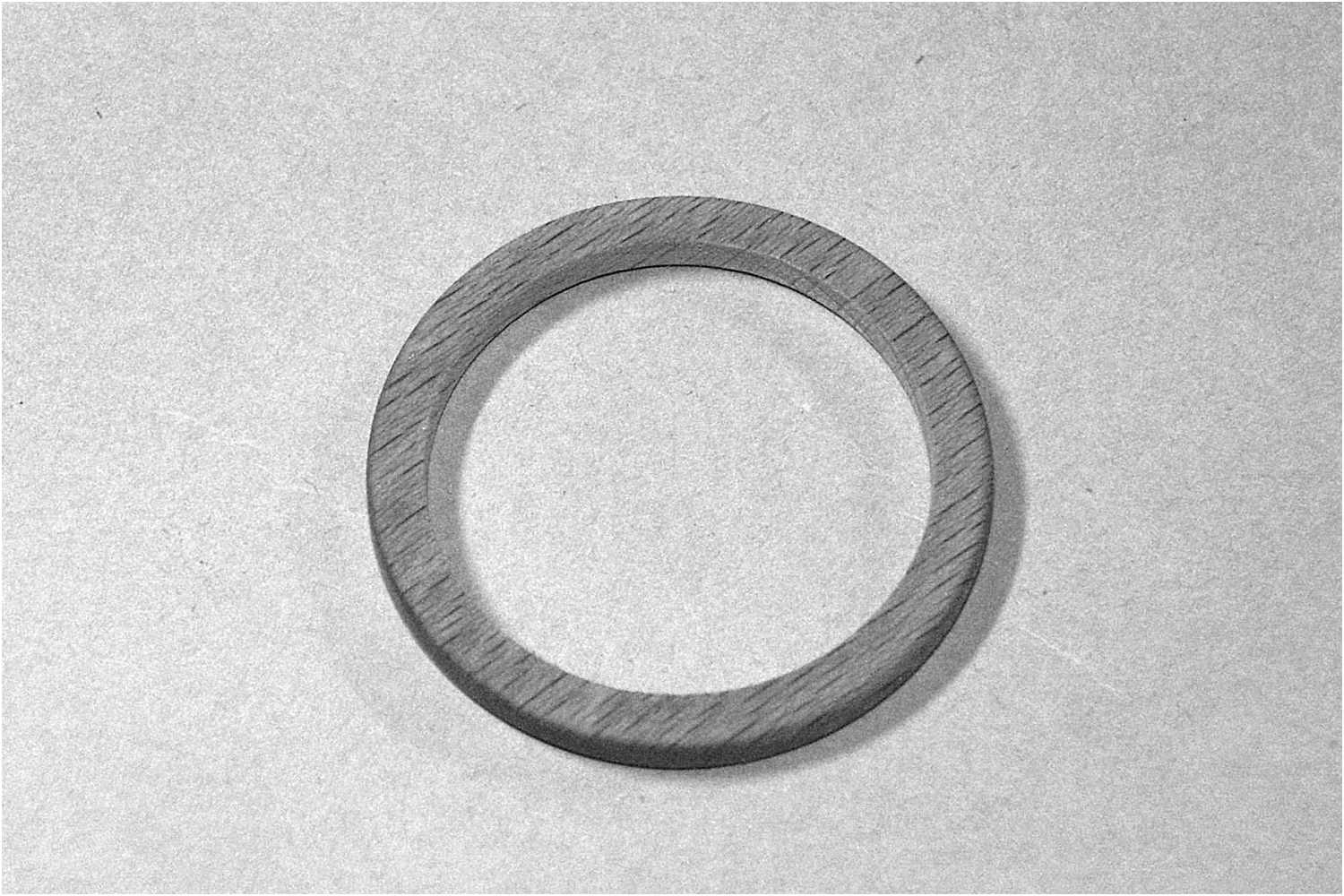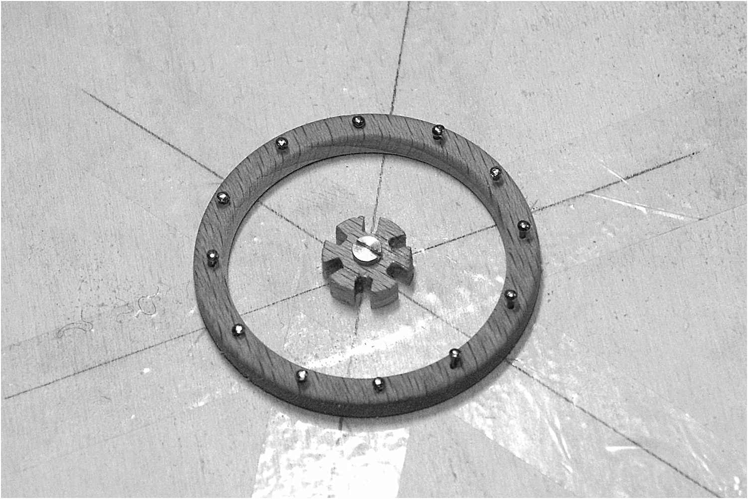 Aus einem Stück Buchenholz wurde der Ring des Steuerrades gedrechselt und auf das Sperrholzbrettchen "aufgenagelt", danach die Öffnungen der Speichen ausgefräst und diese eingelegt.
