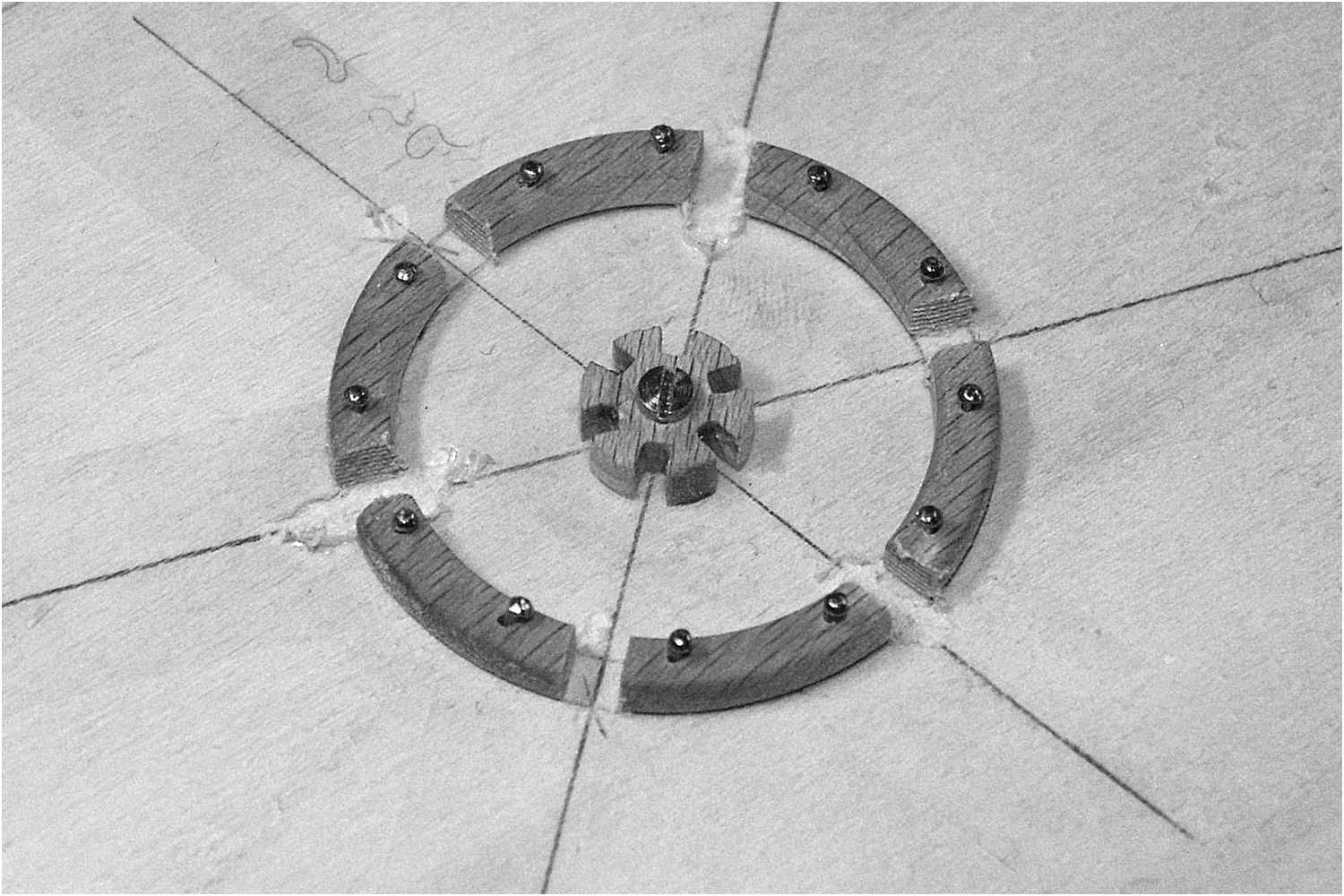 Auf die Hilfslinien habe ich Klebeband befestigt, damit das Steuerrad nicht auf dem Arbeitsunterlage festklebt, wenn später die Speichen in die Nabe eingeklebt werden.