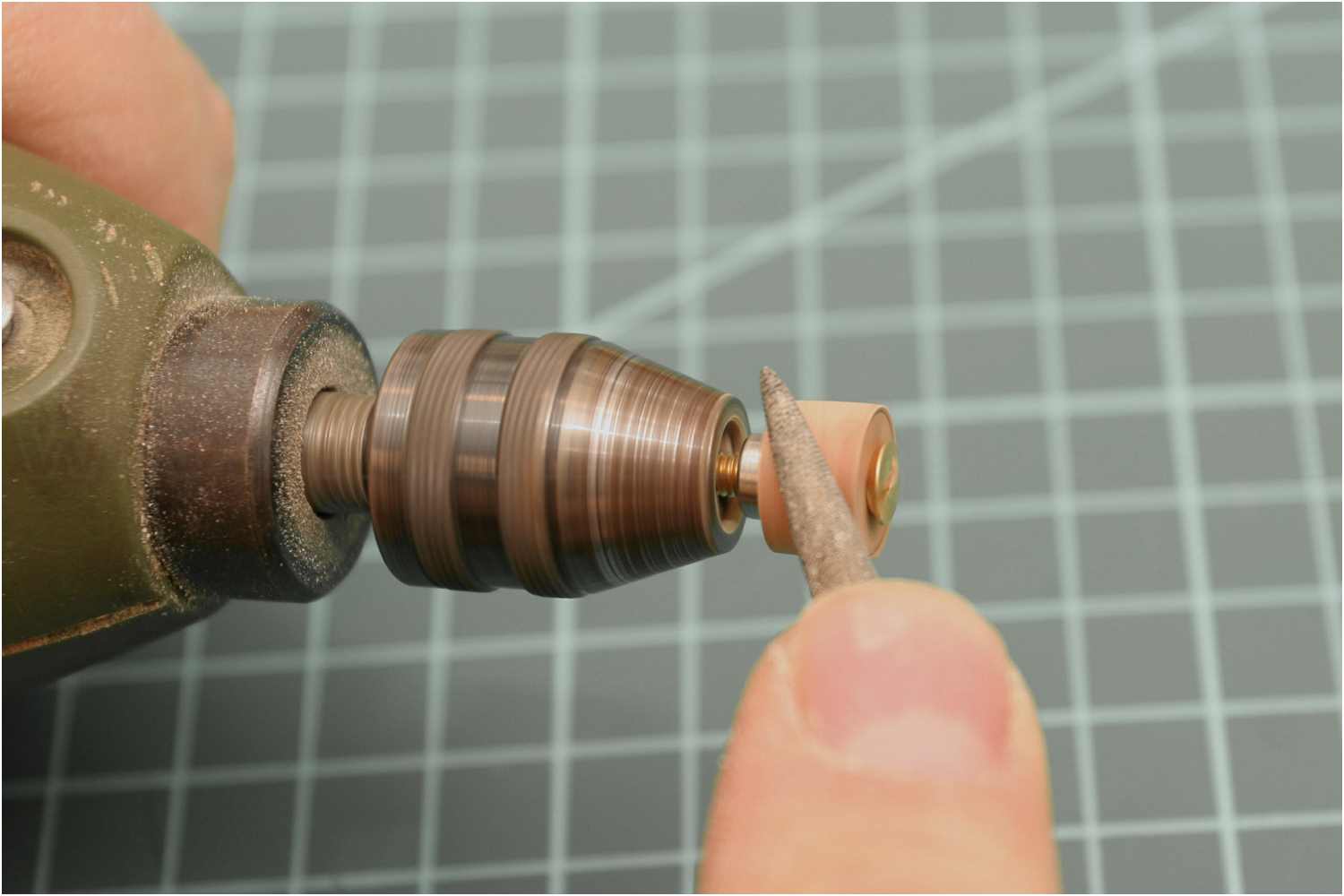 Nun das Ganze wieder in die Handbohrmaschine einspannen und mit möglichst langsamer Drehzahl außen und seitlich sauber abschleifen und "handgerecht" abrunden.