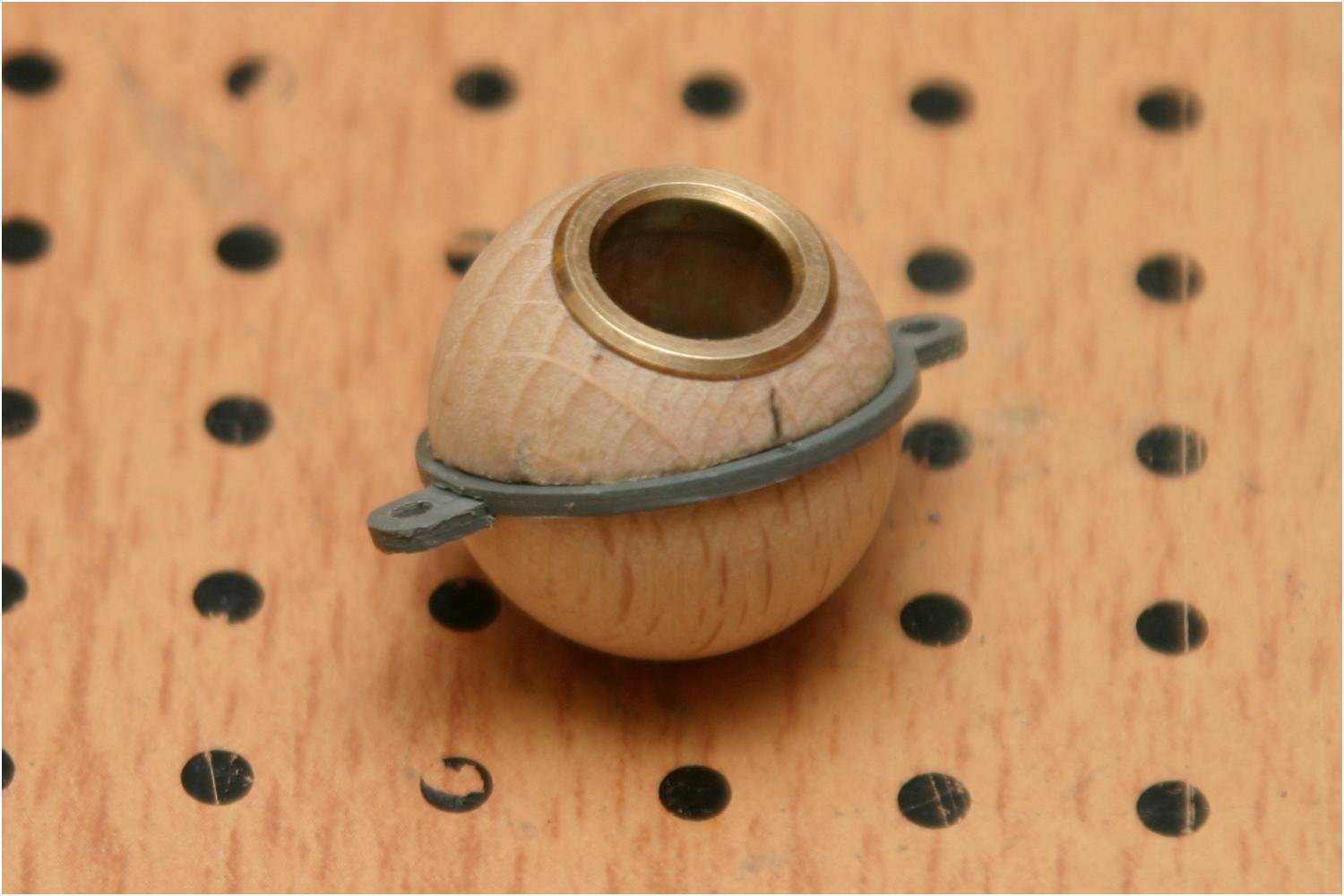 In eine zum Maßstab passende Holzkugel wurde das Sichtfensterchen aufgebohrt.