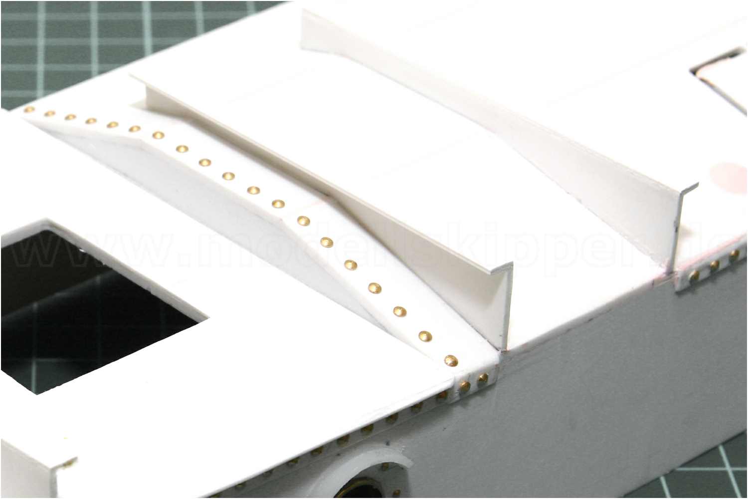 Das Einkleben des Streifens in die Türöffnung ist zwar eine Geduldsfrage, aber nicht unlösbar. Beim Einkleben muss nicht unbedingt genau auf Passung gearbeitet werden, es kann ruhig auch einmal etwas schiefer werden, denn wenn irgend möglich schneide ich "Sachen" generell mit ausreichend Übermaß zu und bringe es später in Form. Das heißt, der PS-Streifen war breit genug, dass ich während des Klebevorgangs nicht so sehr auf die richtige Höhe über dem Aufbau achten musste, sondern nur dass der Streifen bündig auf der Klebestelle aufliegt.