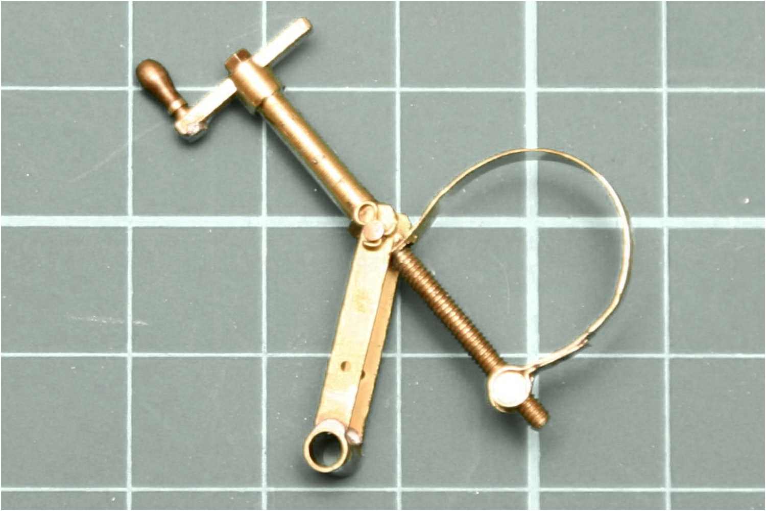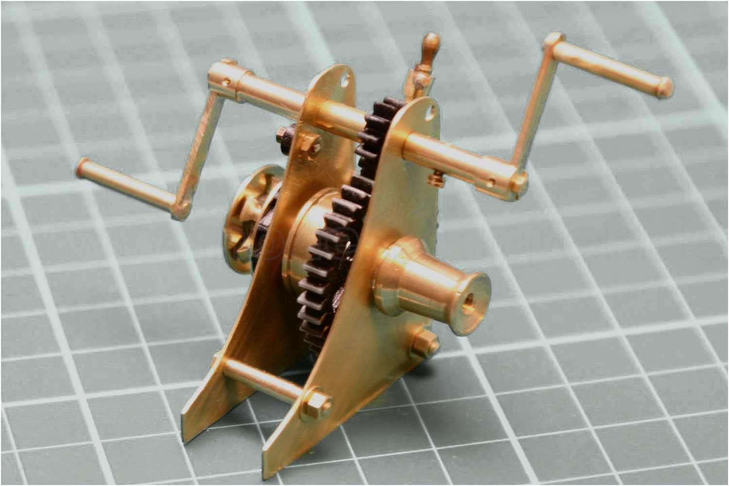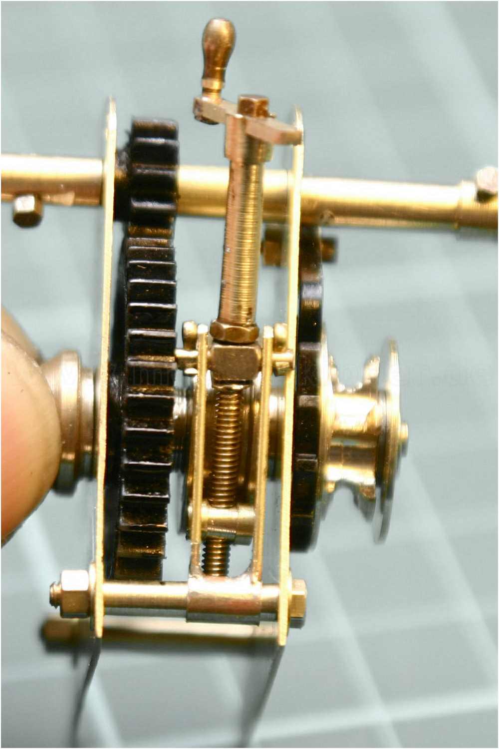 Man beachte die einfache und doch effektive Befestigung der Handkurbel. Es wurden Sechskantschrauben mit 1,2 mm Gewinde verwendet. Auch funktionstüchtig sozusagen, man könnte die Schrauben jederzeit wieder rausdrehen, da ich in die Kurbelachse ein entsprechendes Innengewinde geschnitten habe. Die Handgriffe der Kurbeln sind Messinghülsen und ebenfalls ''gängig''.