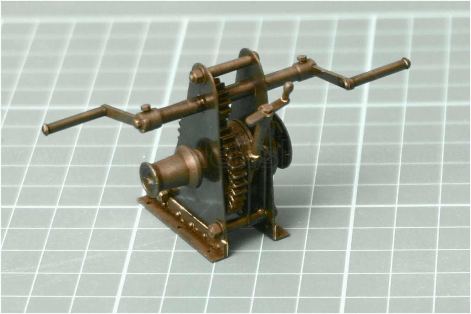 Die Ankerwinde hat noch ein paar Sockelprofile erhalten. Kleine Messingstifte imitieren die Nietverbindung. Die Winde wurde brüniert und ist nun fertig.
