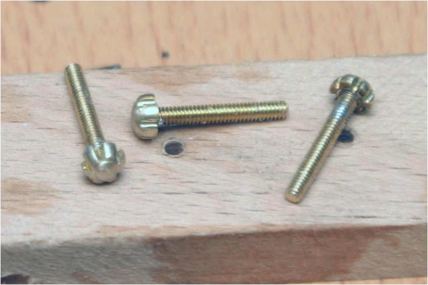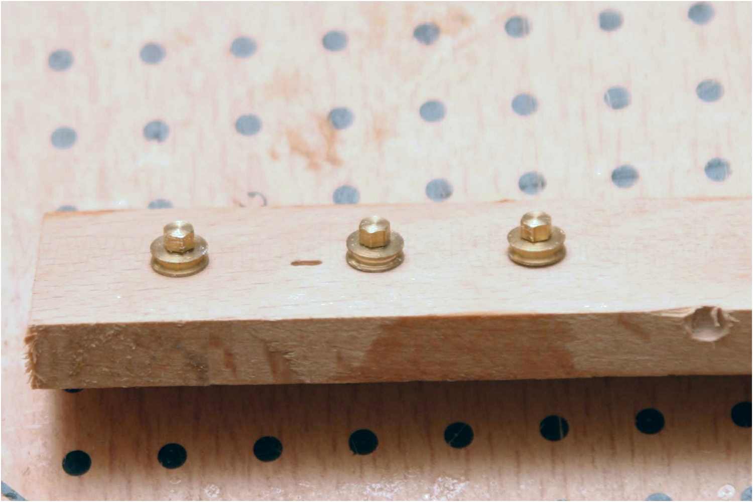 Ich befestigte drei Stück mit jeweils einer 2-mm-Schraube auf einem Holzbrettchen.