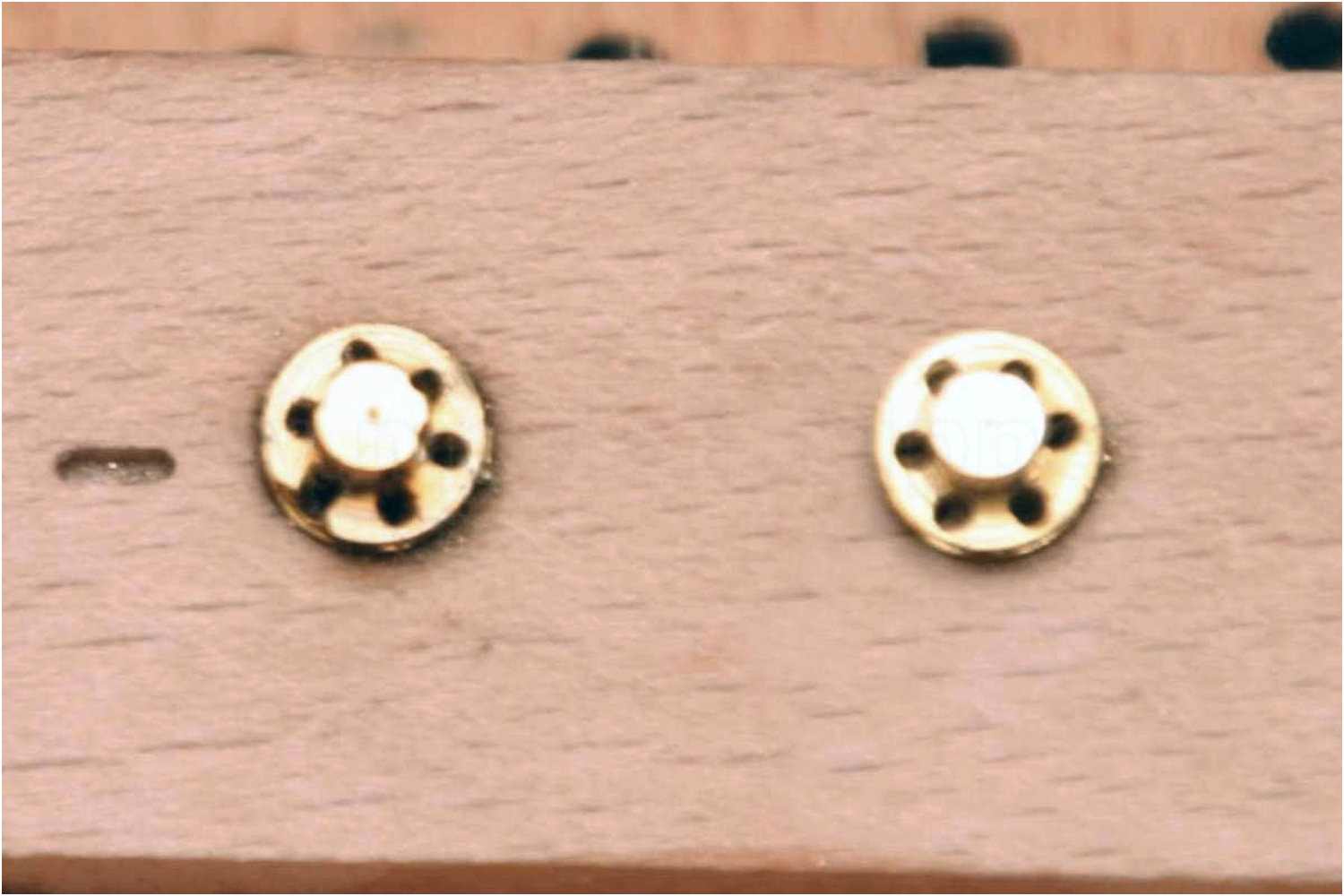 Die Verwendung der Sechskantschraube erwiese sich insoweit recht günstig, da in jede Messingscheibe sechs 0,5 mm Löcher gebohrt werden sollten. Es war also keine Anzeichnen nötig, sondern ich orientierte mich an der jeweiligen Seite des Sechskantes.