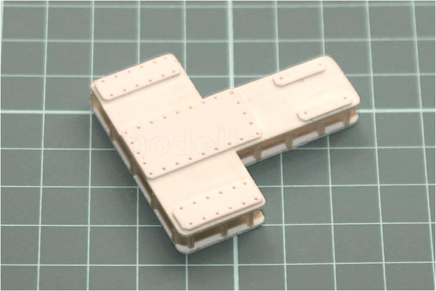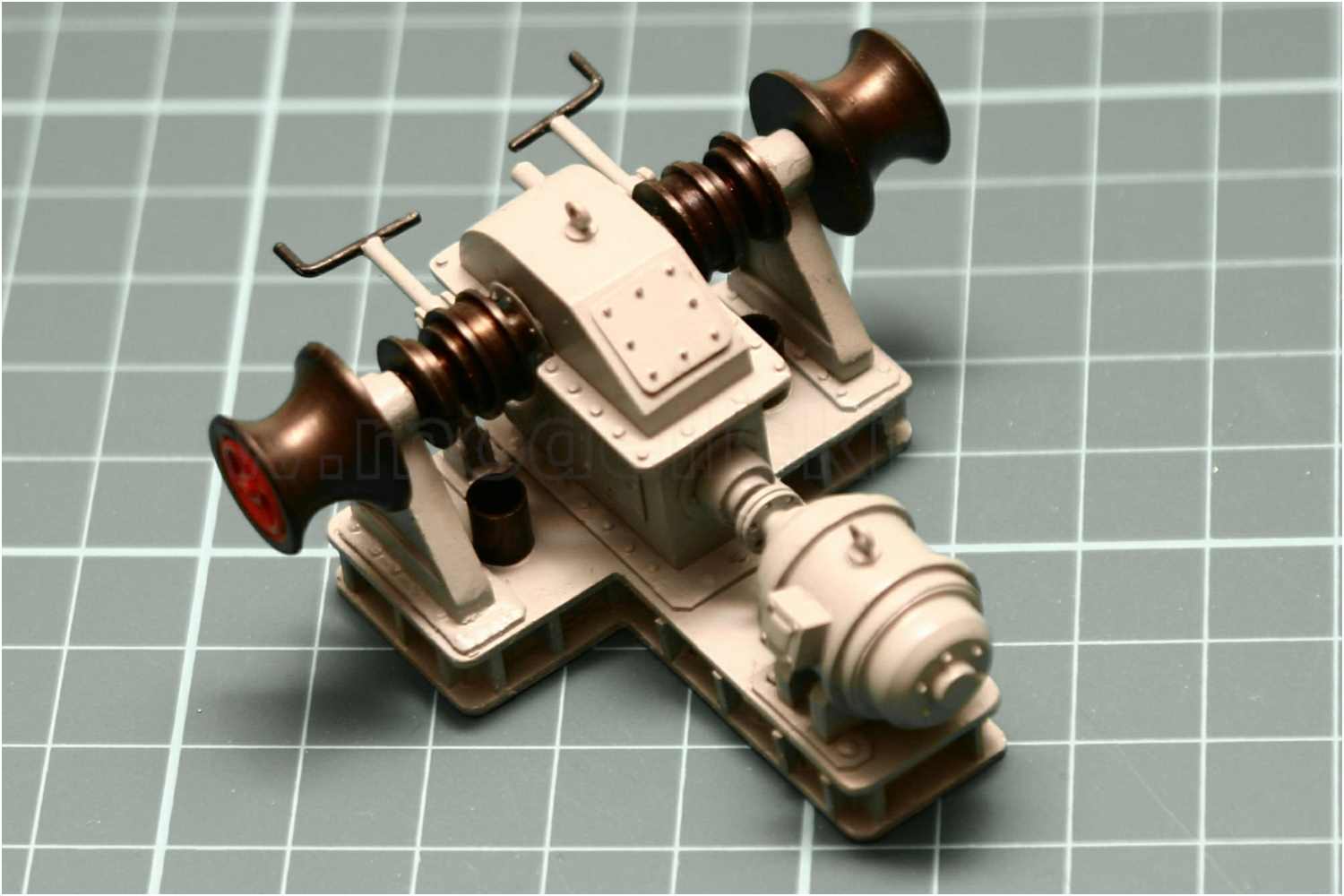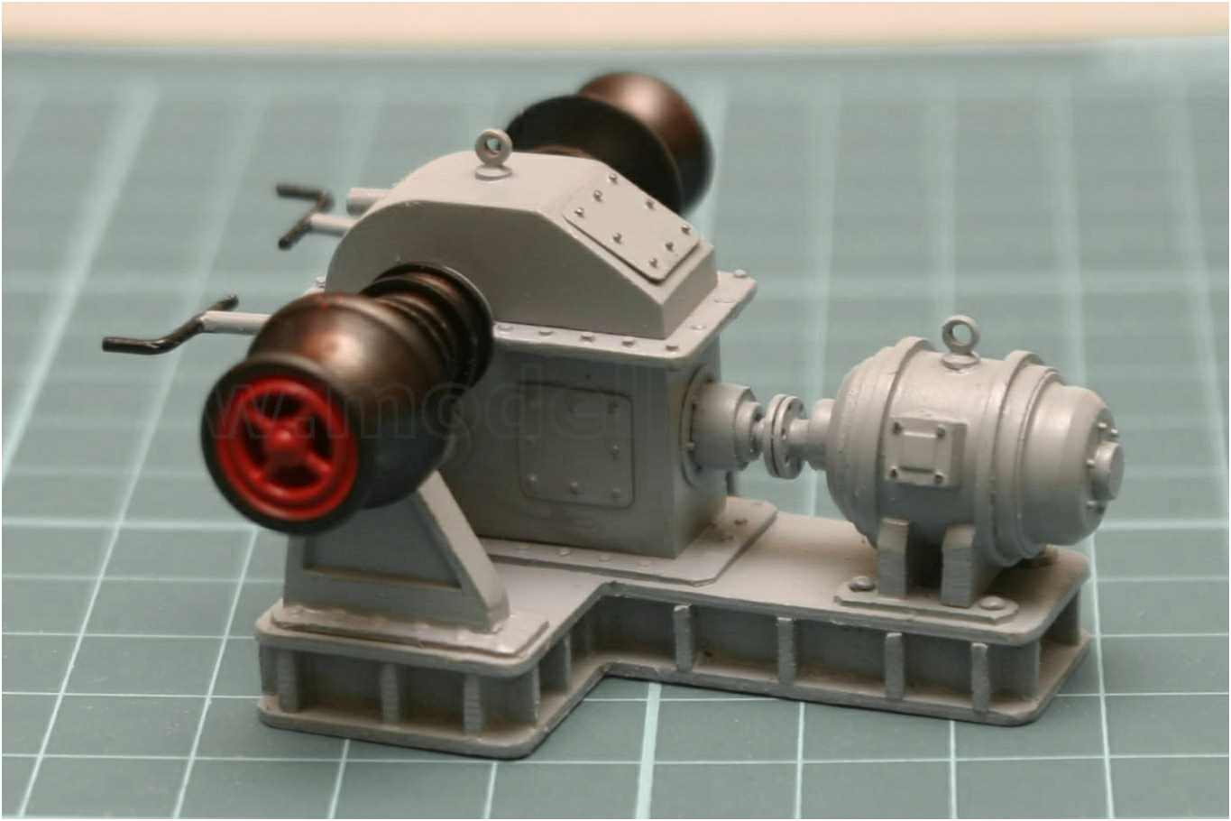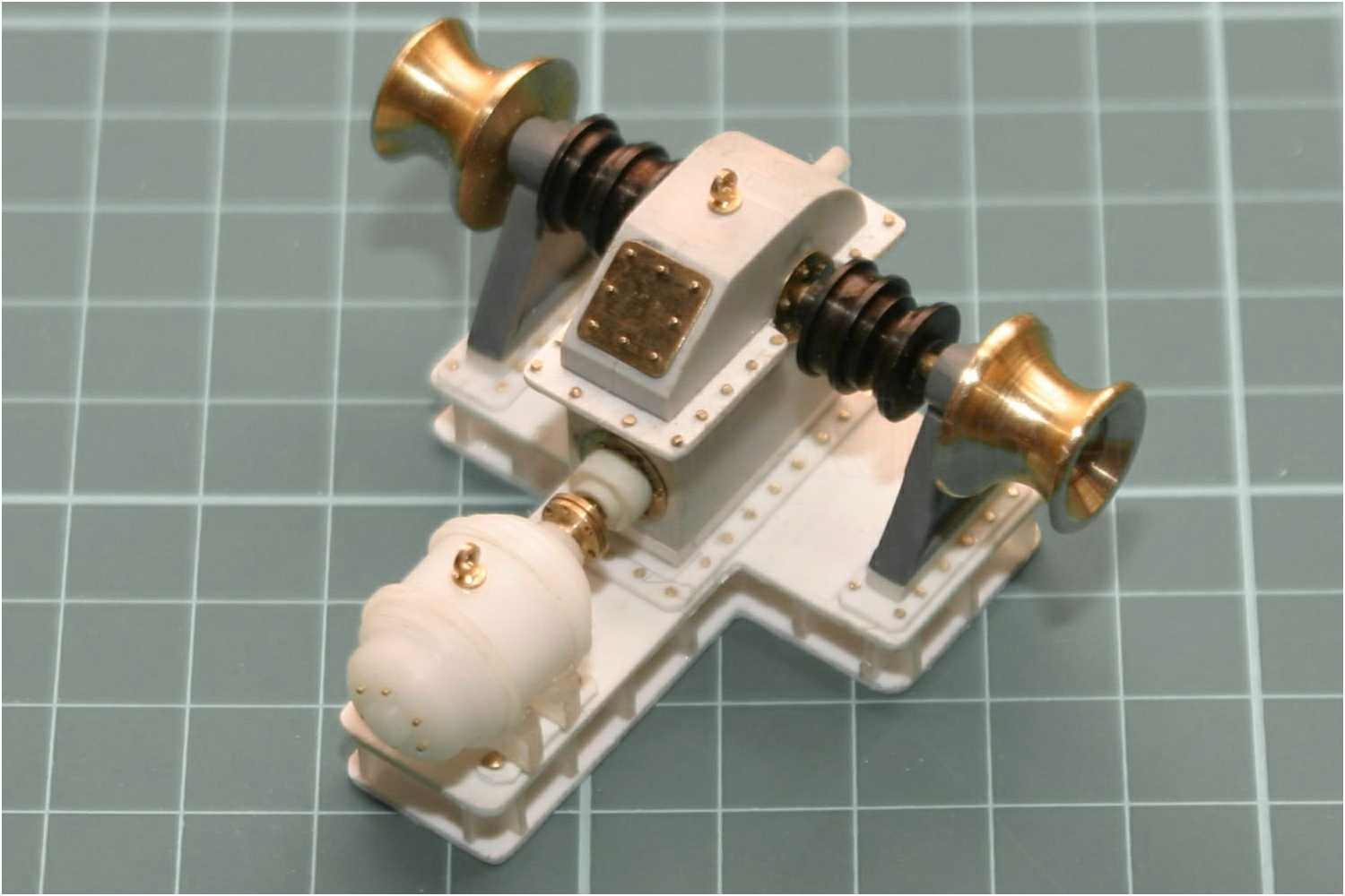 Die Verschraubungen der Sockelplatten sind mit Messingstiften imitiert, das Getriebegehäuse, die Wellenböcke und der Motor aufgeklebt.