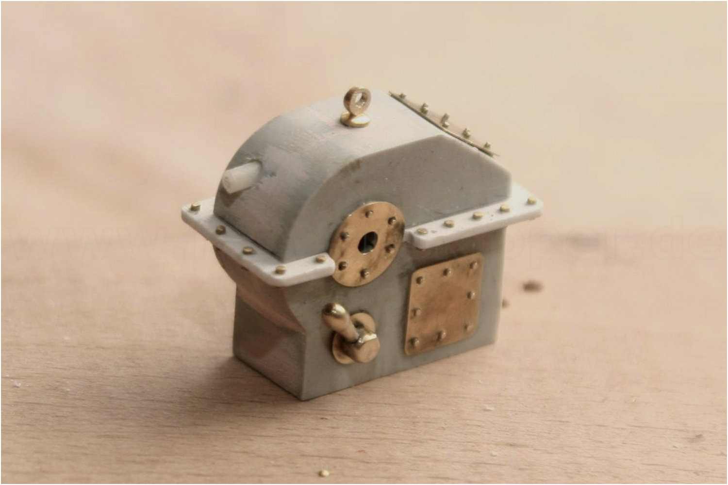 Aus einem Kunststoffblock wurde das Getriebegehäuse gefräst, Serviceluken aus dünnem Messingblech mit Schraubenimitationen und die Süllkante des Gehäusedeckels mit Schraubenimitationen ist fertig.