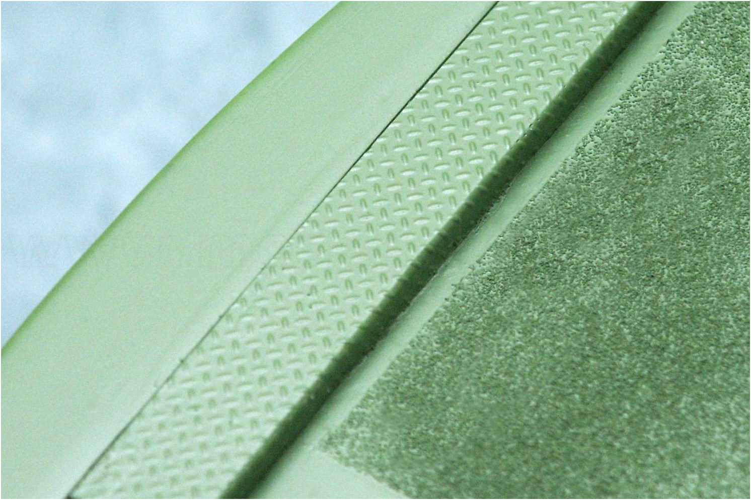 Man sieht an einigen Stellen, an denen ehemals die Abklebungen waren, übriggebliebene Sandkörnchen.