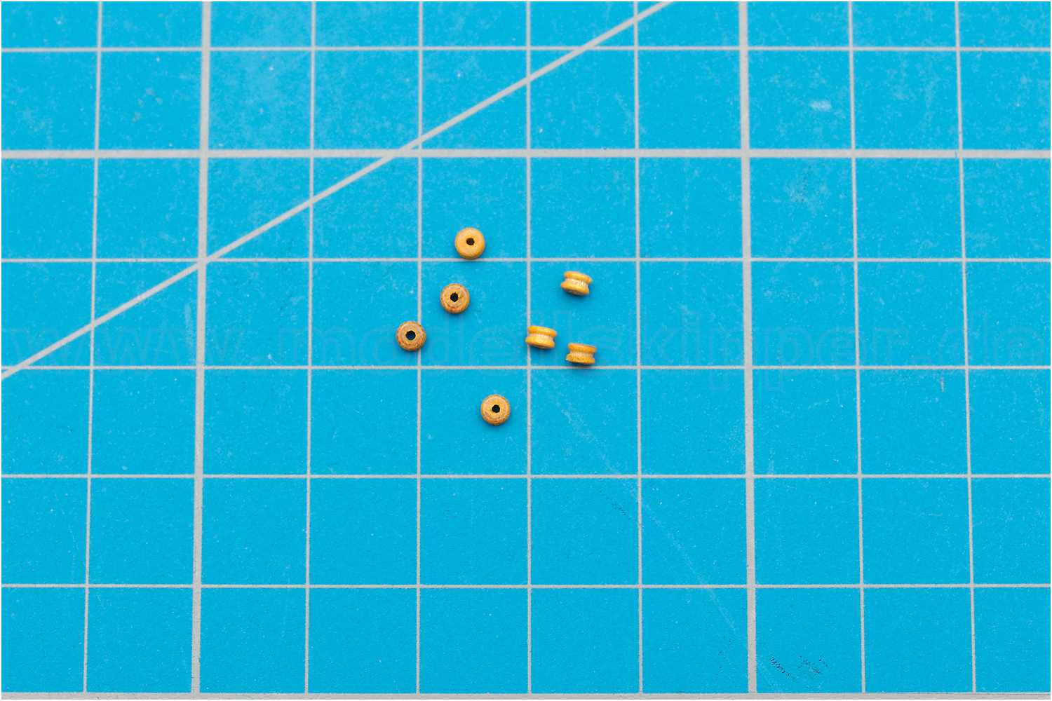 Dazu ein dünnes Rundholz mittig anbohren, mit einem kleinen Sägeblatt Rillen einschschleifen und dann entsprechende Scheiben abschneiden. So können die Kauschen an den Wanttauen angebunden werden.