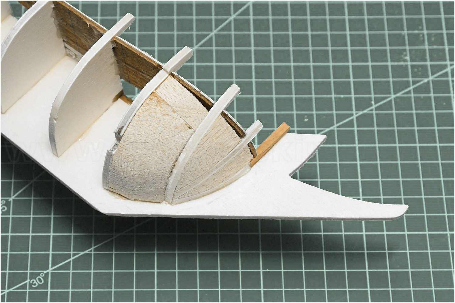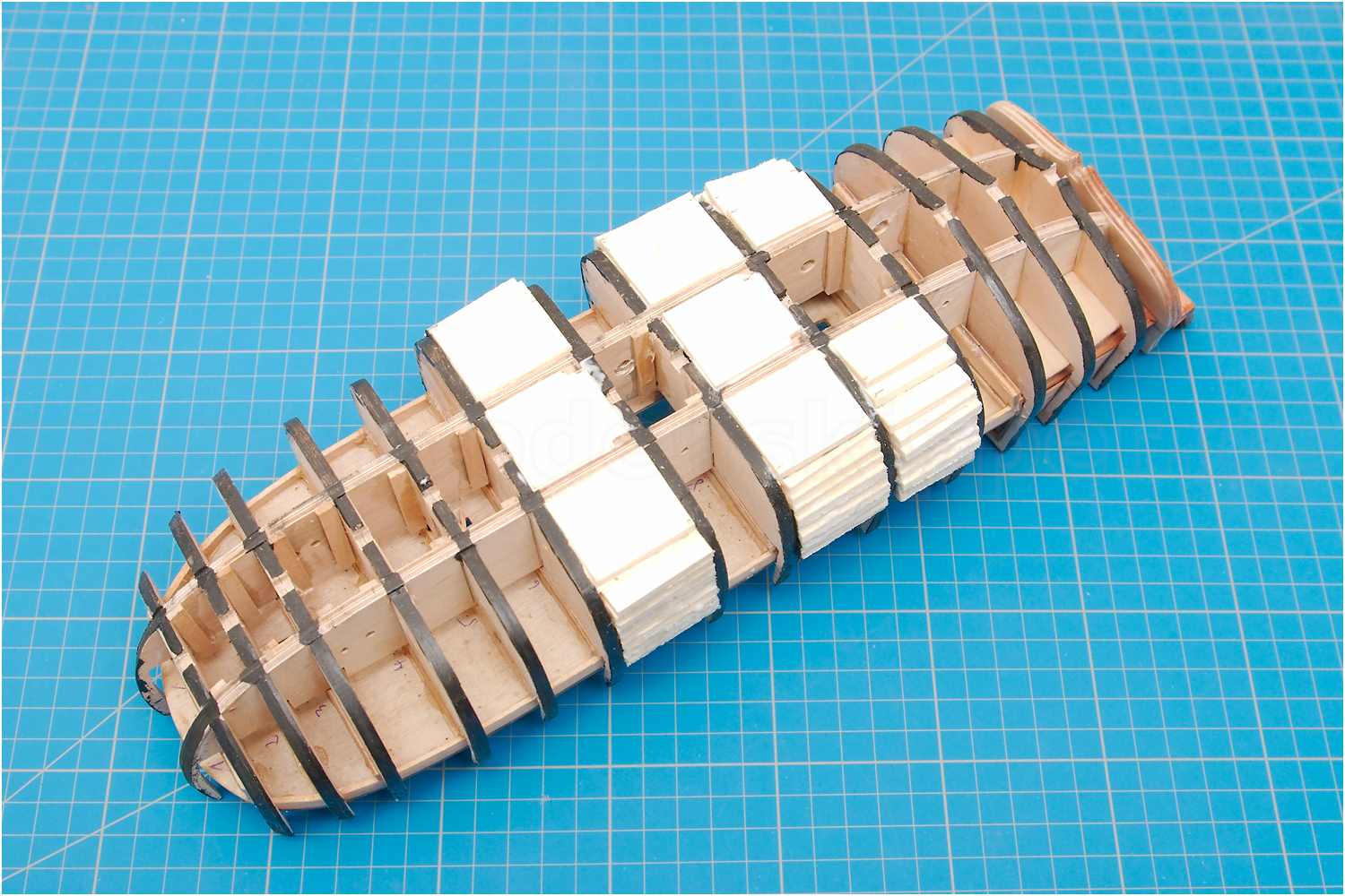 Eine mittlerweile recht verbreitete Methode zur Herstellung von Modellrümpfen ist, in die Zwischenräume der Mallen kleine Holzstücke zu kleben, die dann abgeschliffen werden, um die gewünschte Form des Rumpfes zu erhalten.