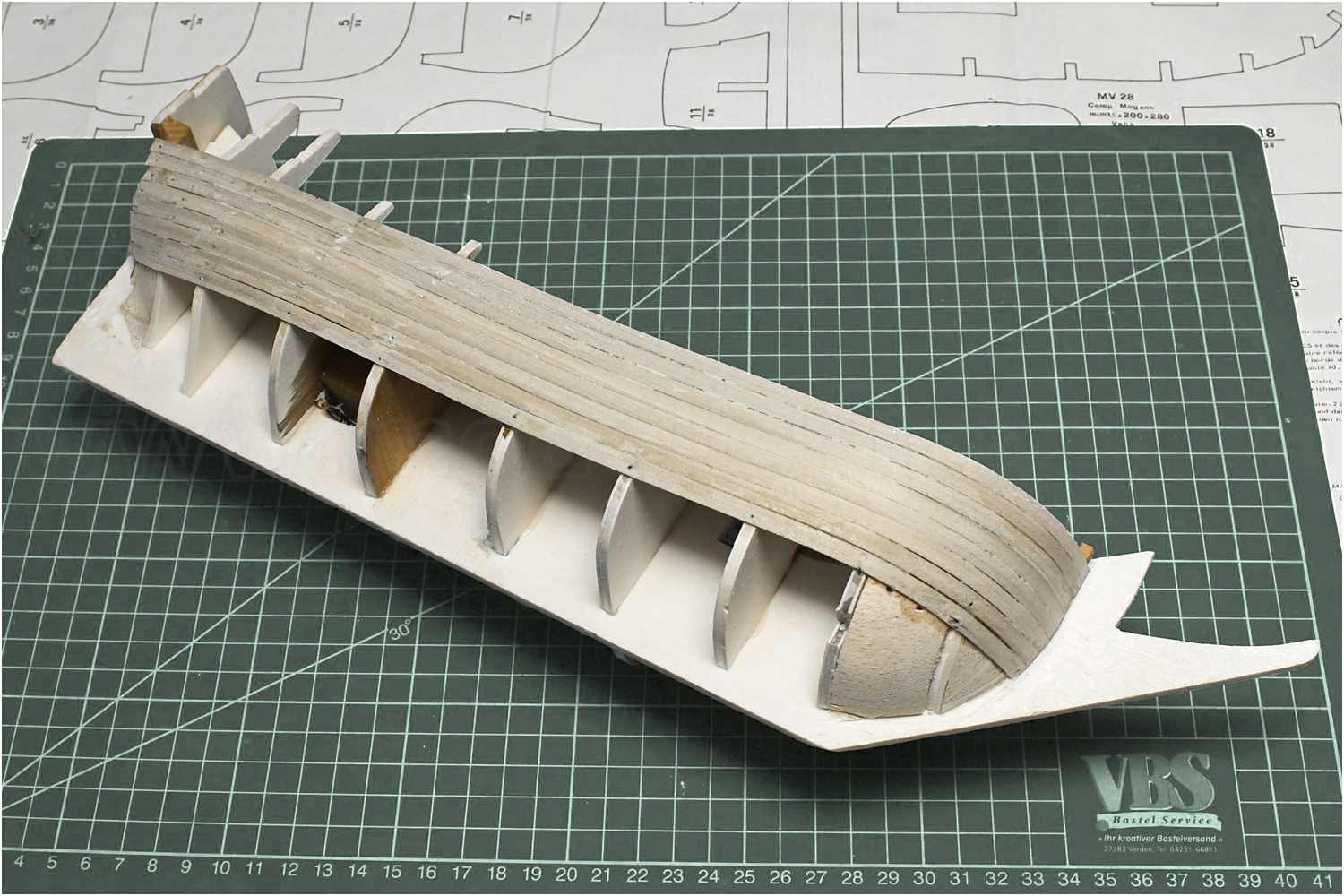 Oftmals werden nur Bereiche am Bug und Heck mit Holzklötzen aufgefüllt und dann die erste Beplankung mit Leisten direkt auf die Mallen aufgebracht.