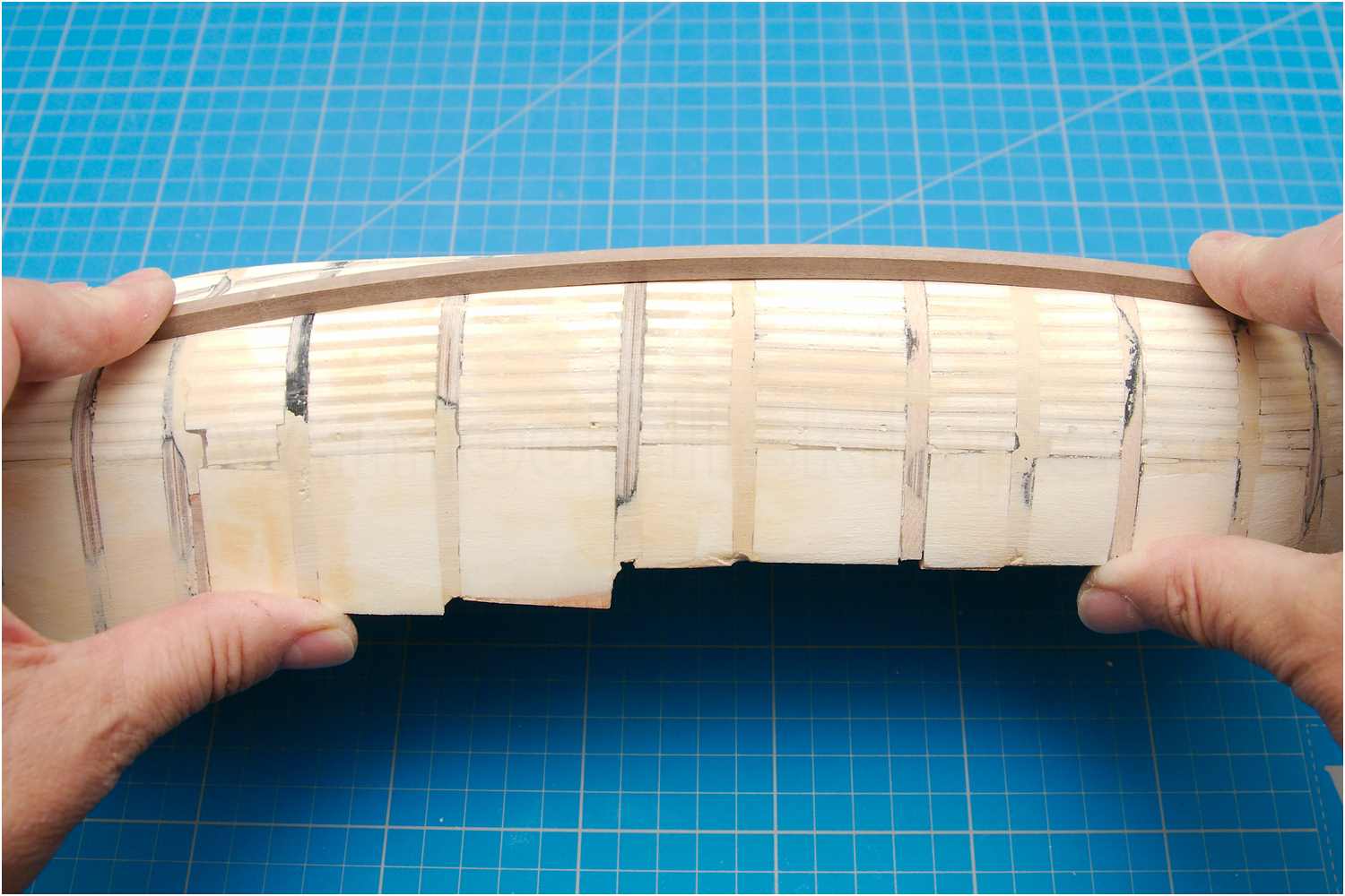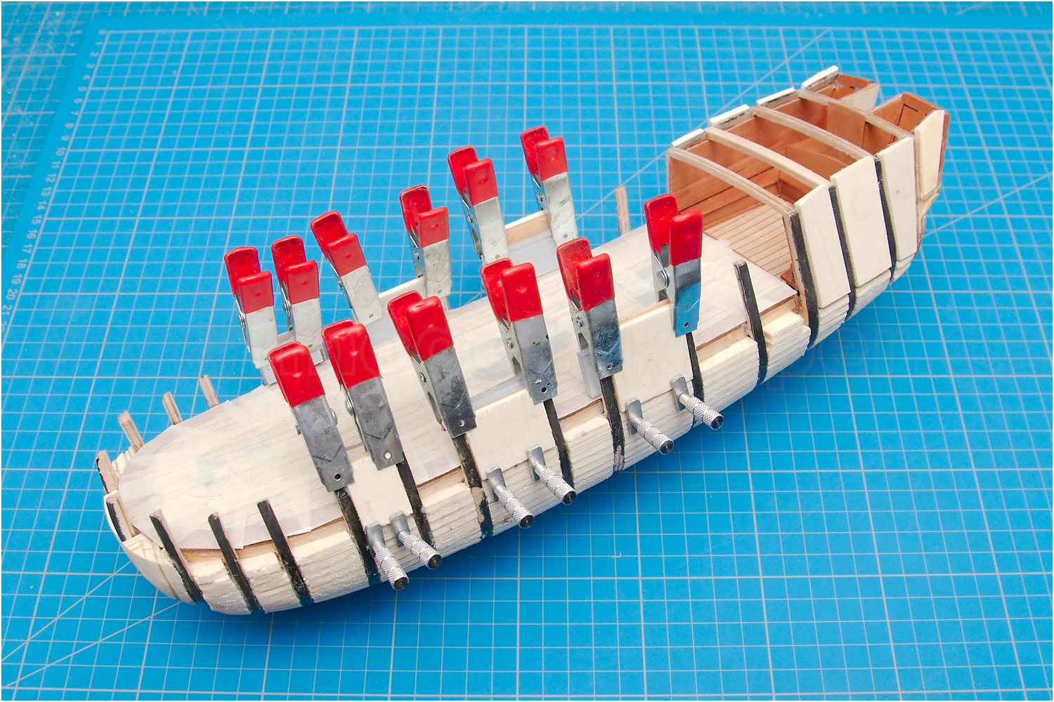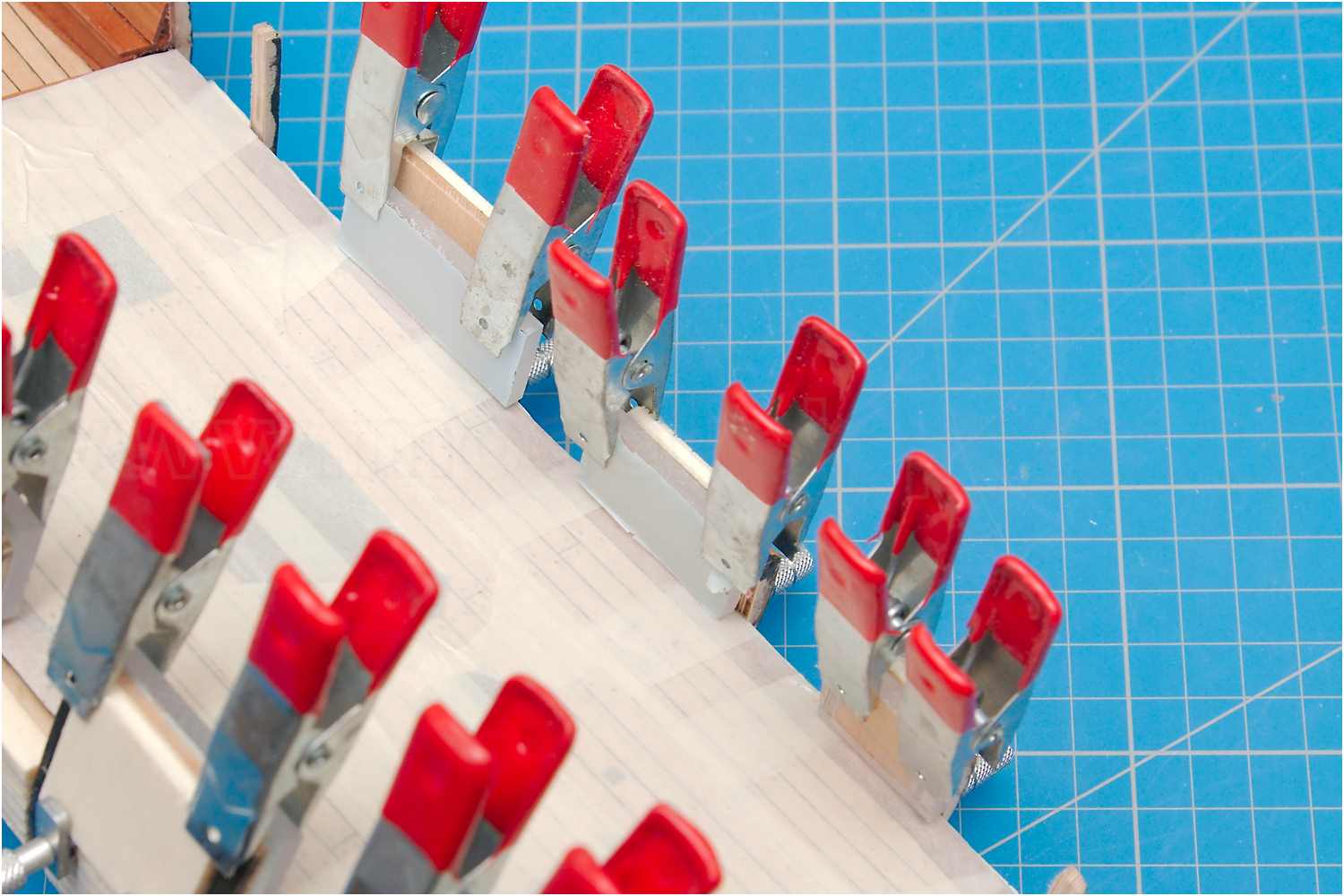 Dann, beginnend von der Unterkante Deck zum Kiel, schichtweise Füllhölzer einkleben und mit einer Zwinge fixieren.