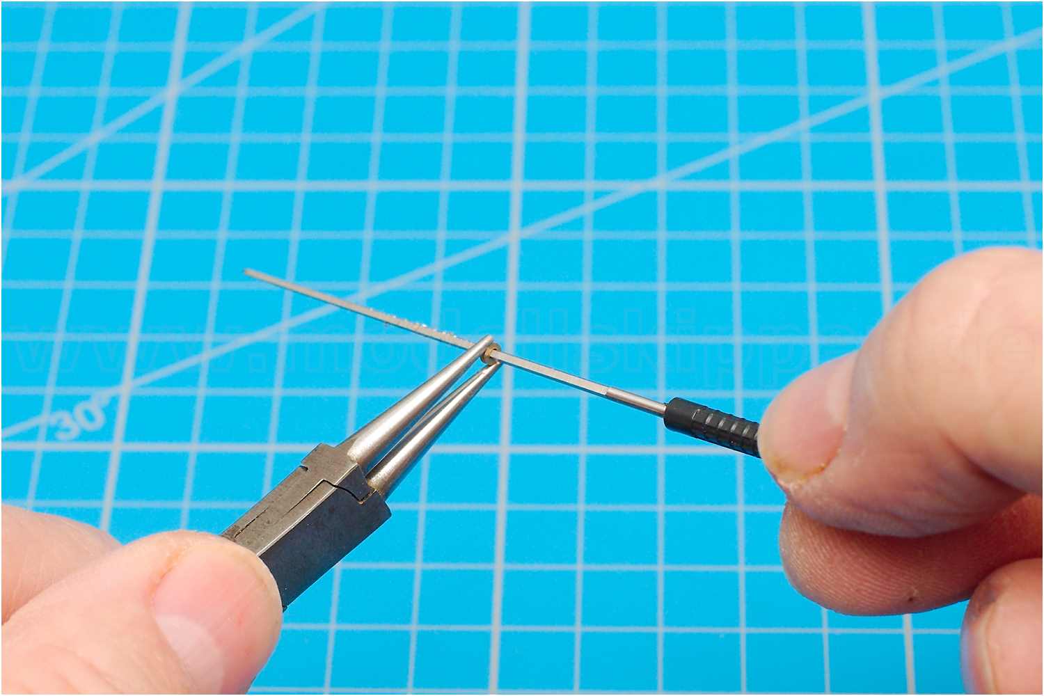 Es müssen noch die Löcher der Scheiben "aufgebohrt" werden, dazu sind allerdings normale Bohrer nicht geeignet. Hier nutzt man kleine Reibahlen, da die Bohrung durch die langgezogene konische Form der Ahle gezielt erweitert und so das Loch bis auf die notwendige Größe aufgerieben werden kann. Diese Reibahlen findet man ebenfalls im Modellbauhandel, aber auch im Sortiment für Uhrmacherwerkzeuge.