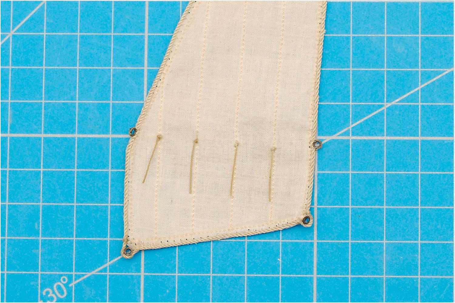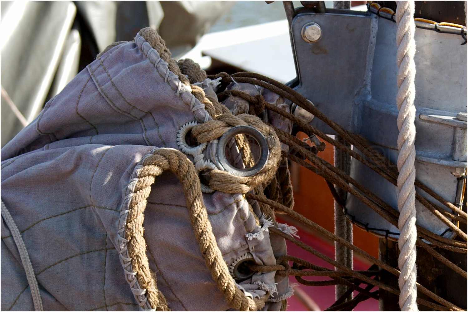 Beispiele für Rundkauschen mit einem Legel am Segel befestigt, oder als Hals- und Schotkausch in das Liektau eines Segels eingebunden.