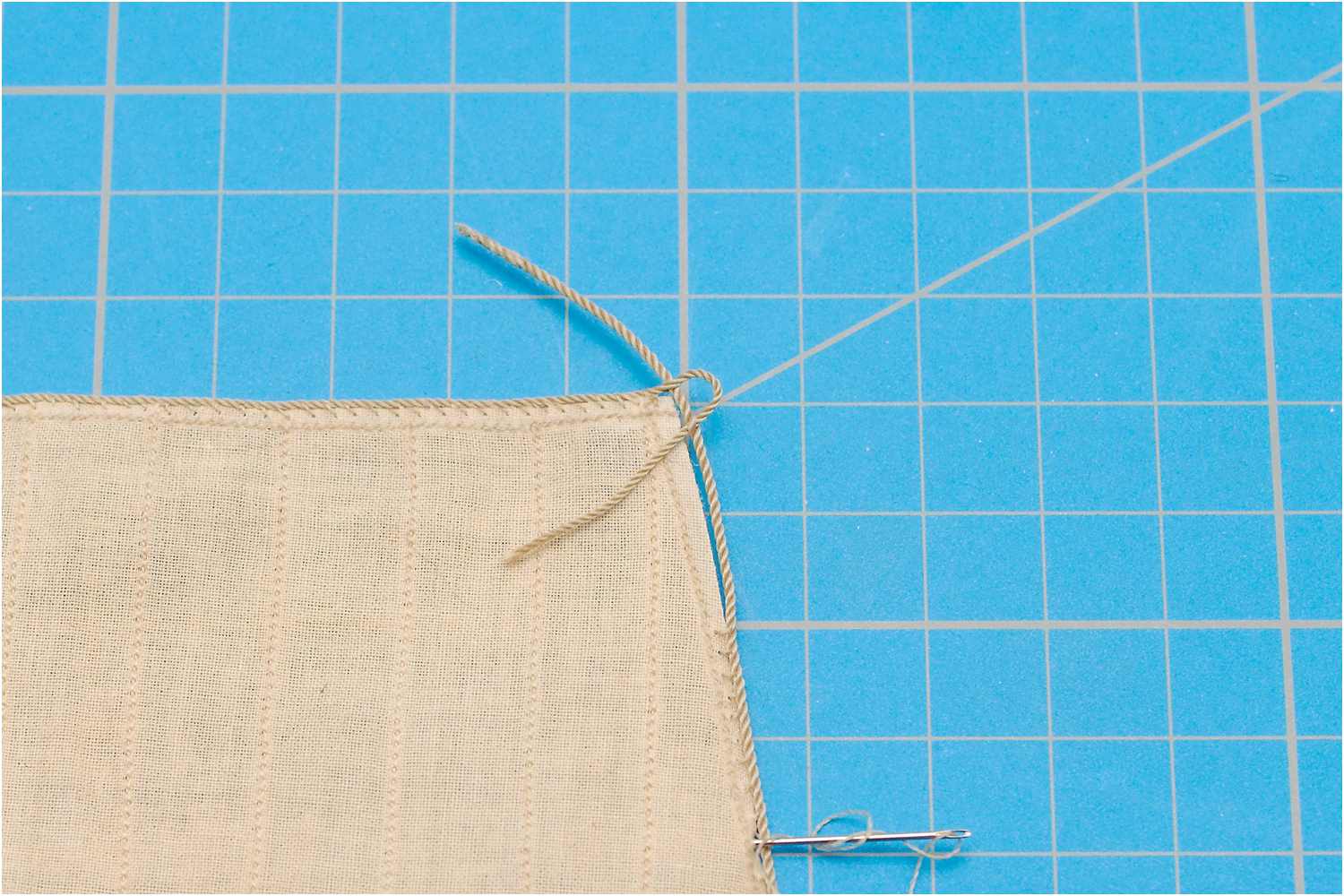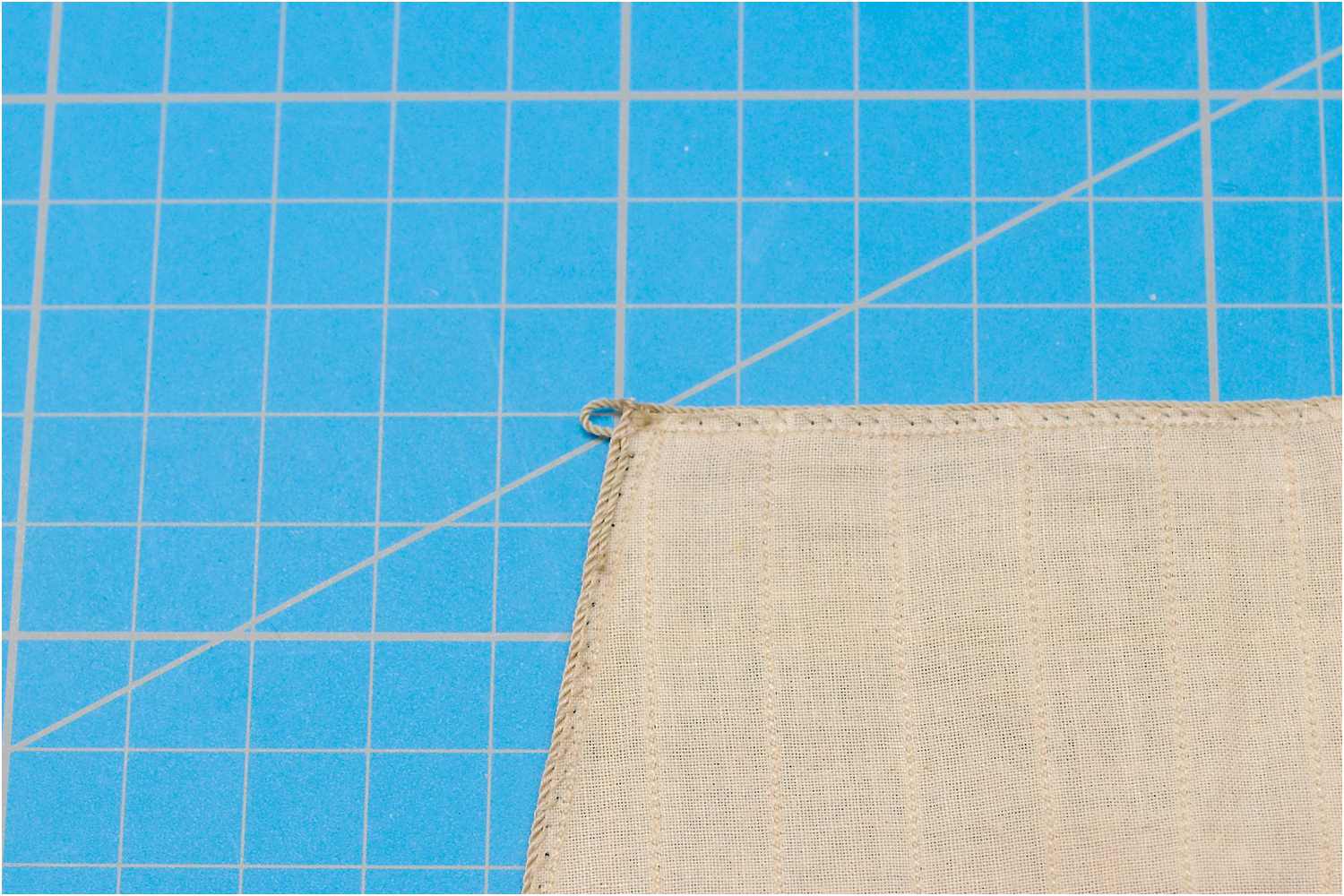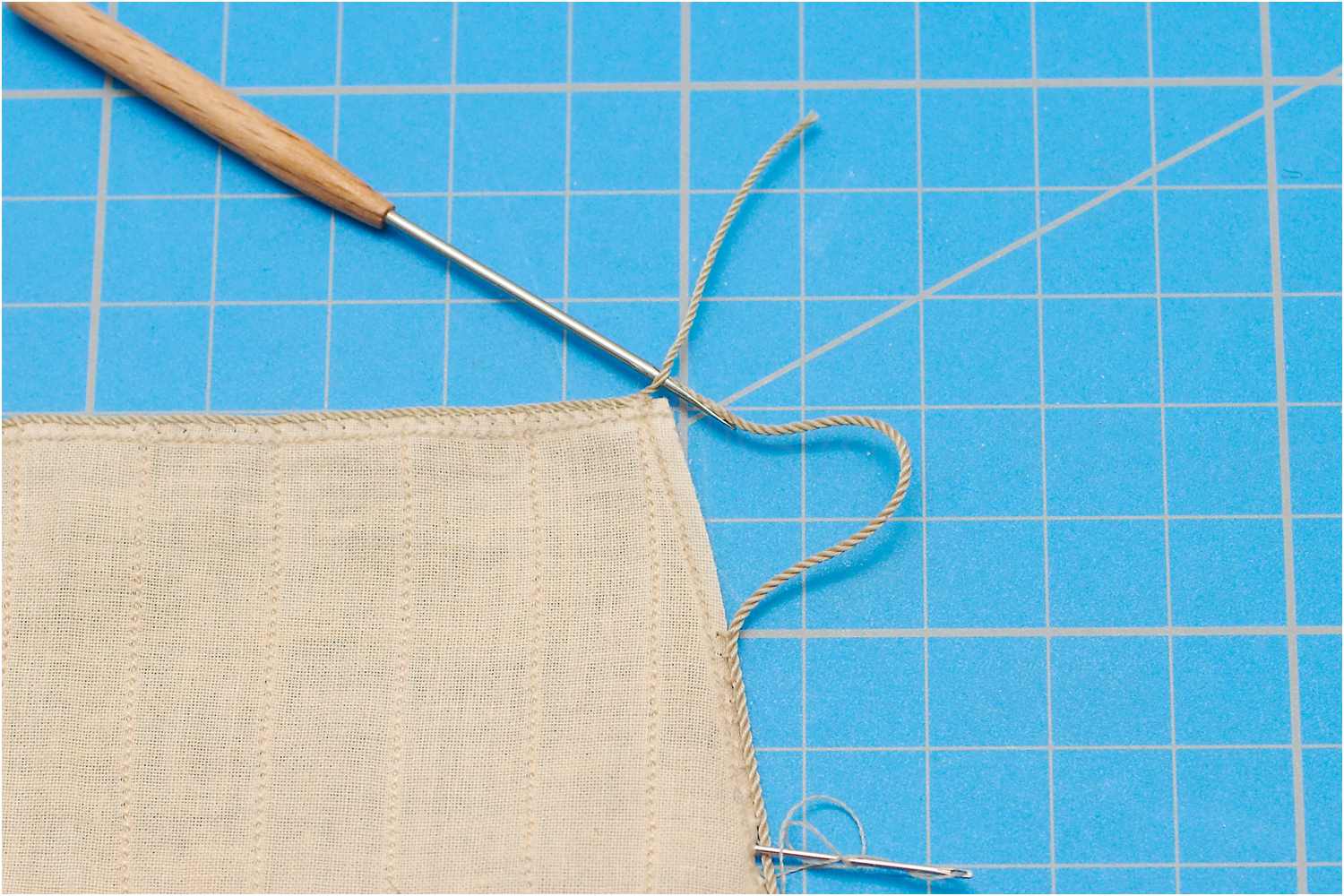 Das Liektau nähe ich mit der Hand an und beginne mittig am Kopfliek des Segels. Da ich rechtsgeschlagenes Tau verwende, steche ich die Nadel oben in den Stoff, dann verläuft der Faden wie die Rillen des Liektaus.