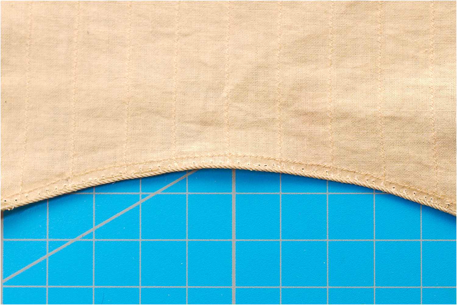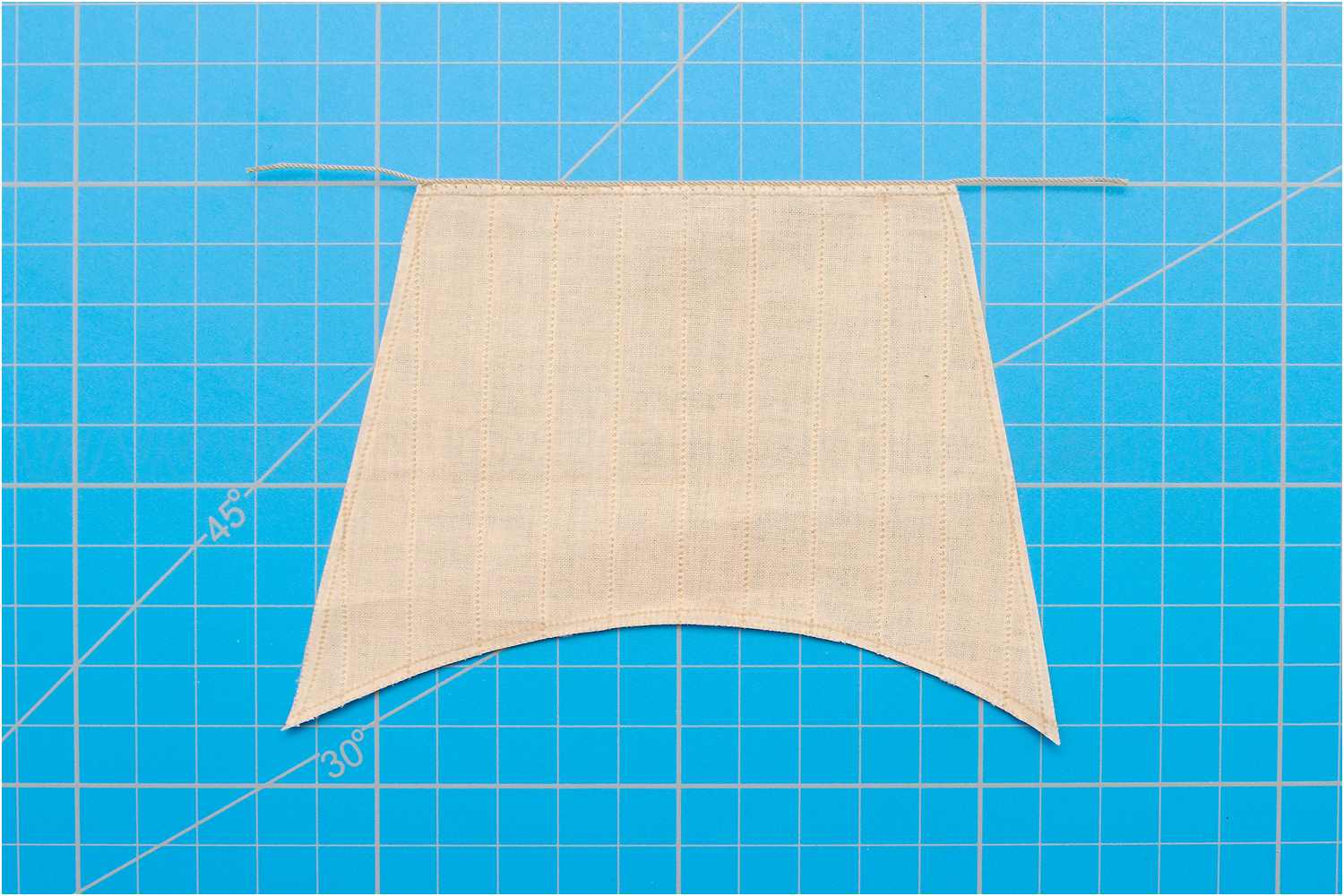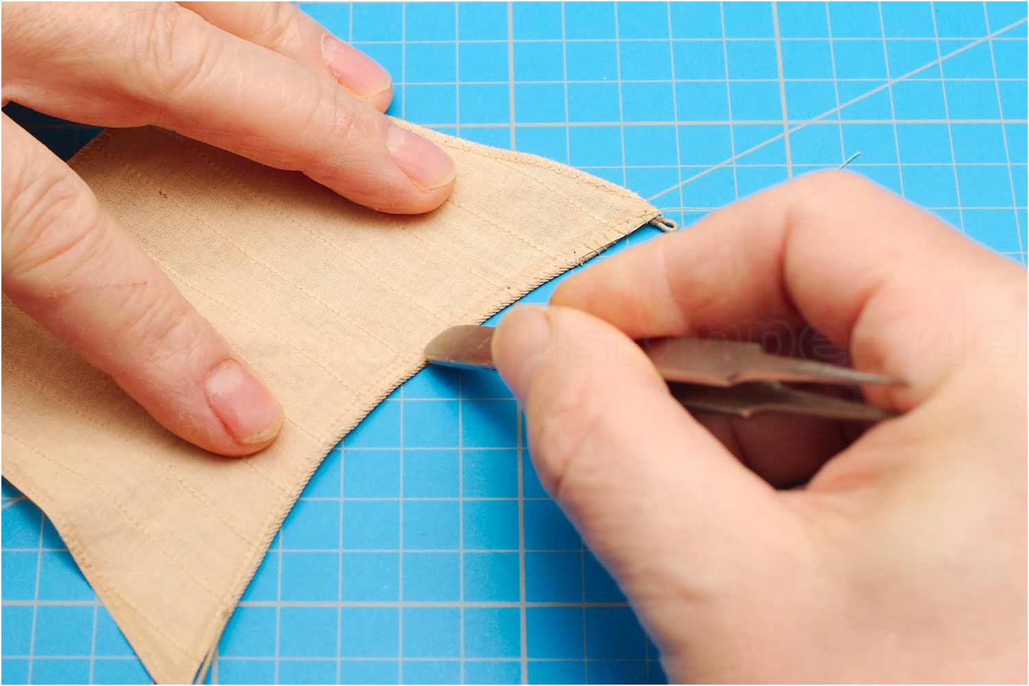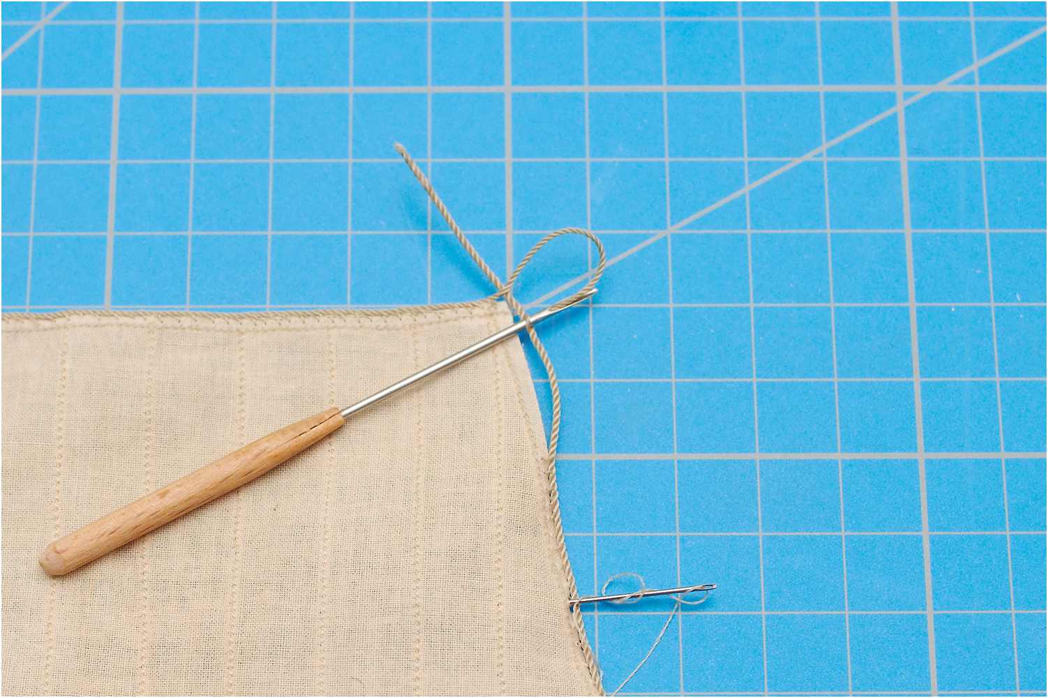 Das Liektau nähe ich mit der Hand an und beginne mittig am Kopfliek des Segels. Da ich rechtsgeschlagenes Tau verwende, steche ich die Nadel oben in den Stoff, dann verläuft der Faden wie die Rillen des Liektaus.