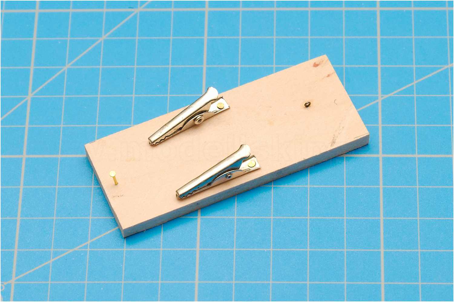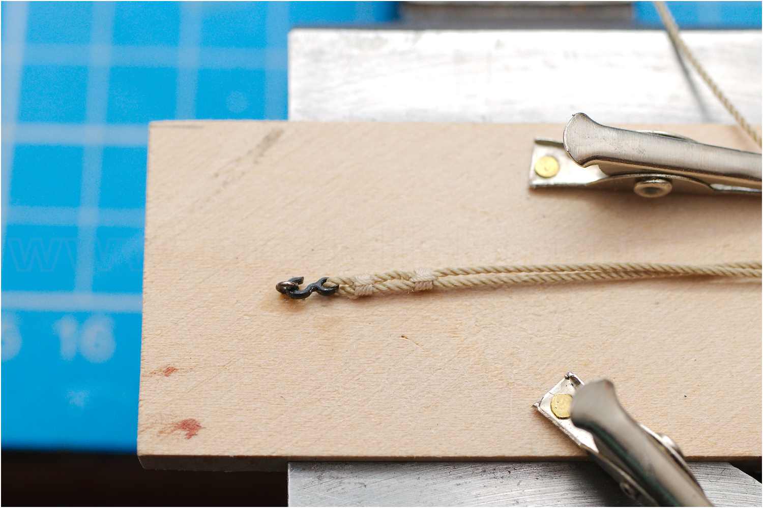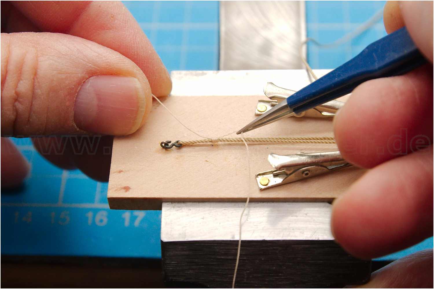 Um z.B. Haken in ein Auge einzubinden, befestigt man auf einer Seite des Brettchens einen kleinen Augbolzen, gegenüber einen Messingstift oder Nagel. Mittig zwei kleine bewegliche Krokoklemmen. Man hat quasi eine ähnliches Prinzip wie bei einer dritten Hand. Zum freihändigen Arbeiten spannt man das Brettchen in einen Schraubstock ein.
