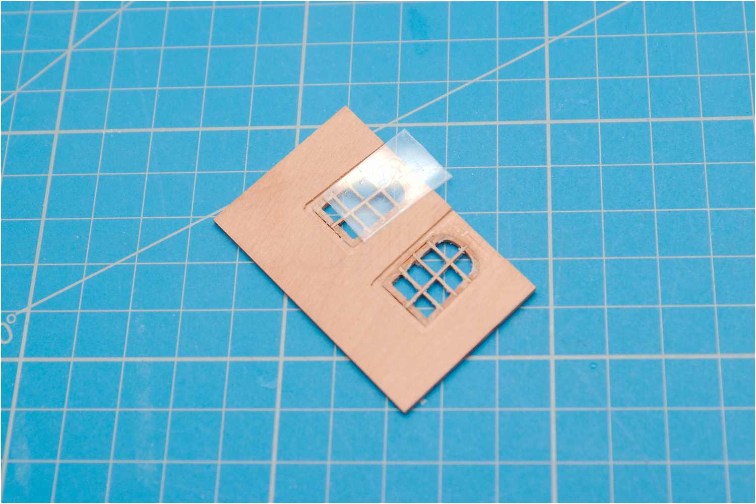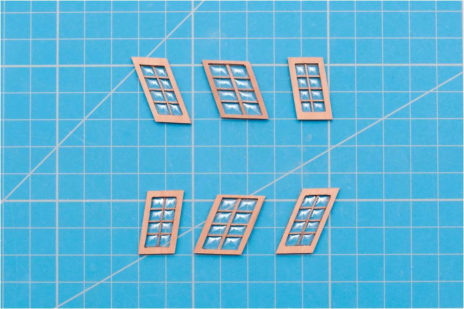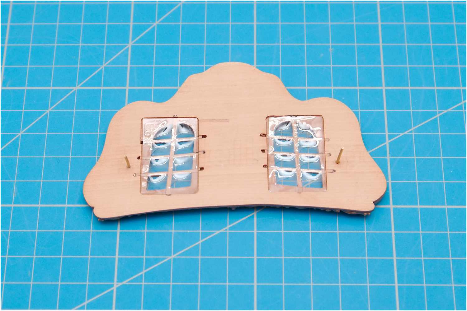 Für die 1. Variante, mit nach innen gewölbten Scheiben kam wieder Laminatfolie zum Einsatz, die in einer gefrästen Tasche hinter die Fenster geklebt und auf der Vorderseite mit Klarlack ausgegossen wurde.