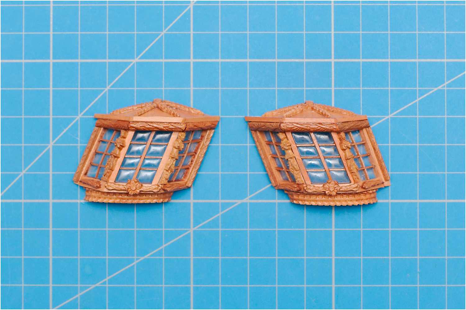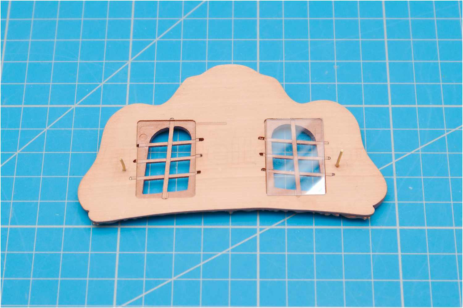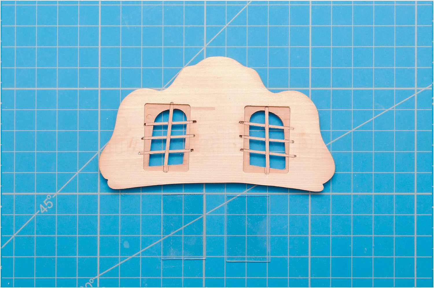 Für die 1. Variante, mit nach innen gewölbten Scheiben kam wieder Laminatfolie zum Einsatz, die in einer gefrästen Tasche hinter die Fenster geklebt und auf der Vorderseite mit Klarlack ausgegossen wurde.