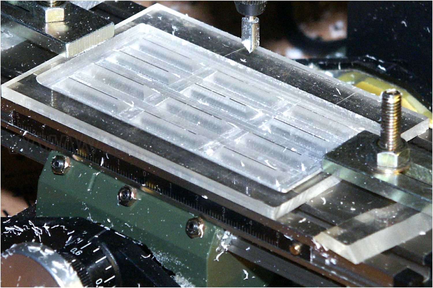 Jetzt werden die Prismen aus dem Acrylglas gelöst, indem man noch einmal mit einem dünnen Fräser in der Mitte der vorher ausgearbeiteten Nuten die Teile herausschneidet, so, das bei Bedarf ein kleiner Rand erhalten bleibt.