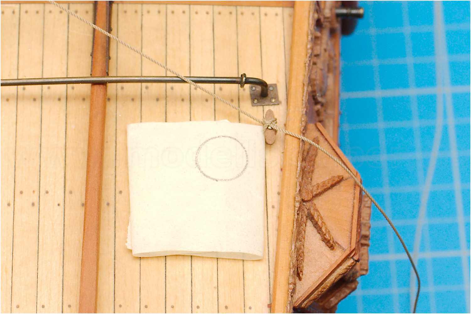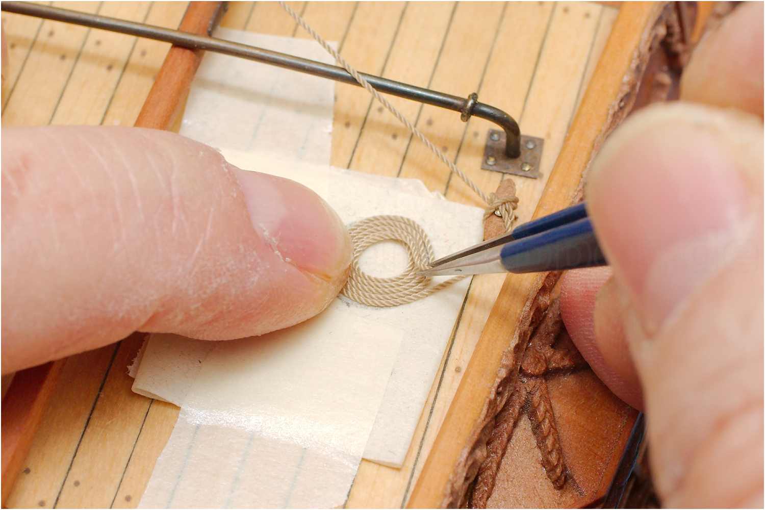 Dazu faltet man ein Stück Malerkrepp, sodass es einerseits auf dem Deck klebt und andererseits, das Tau beim Legen der Spirale fixiert wird.