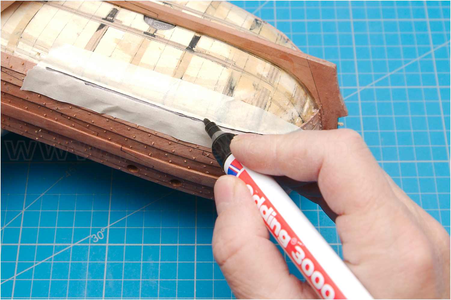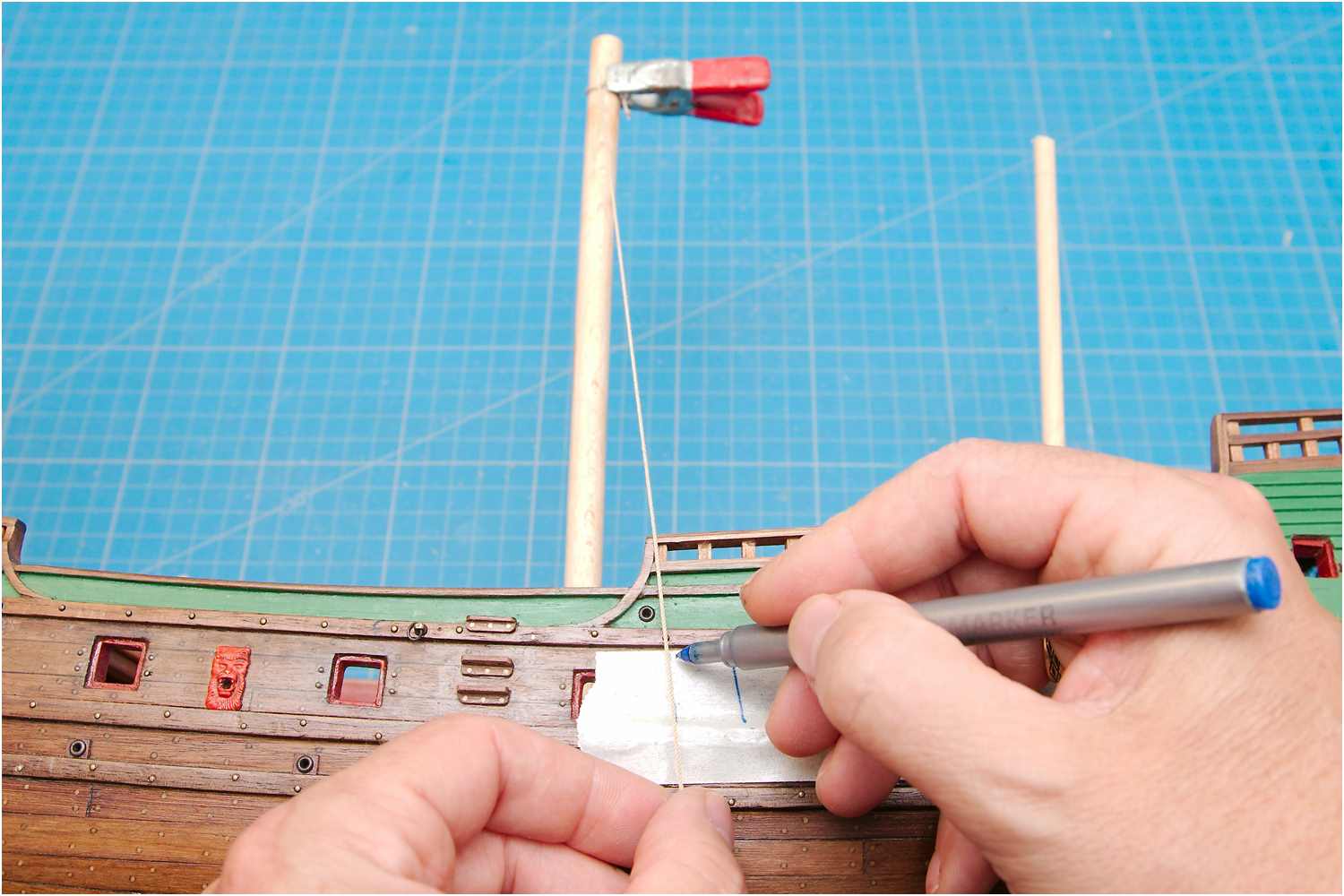 Ganz nützlich für temporäre Markierungen, z.B. beim Ermitteln des Verlaufs von Wanten zum Festlegen der Position der Bohrungen für die Püttingseisen, oder Markierungen beim Ausrichten eines Masts.