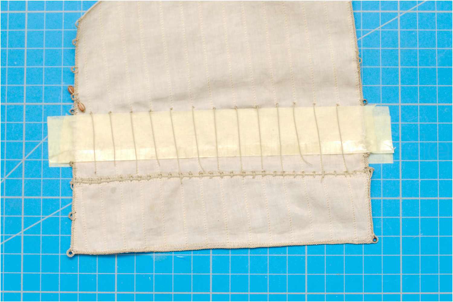Malerkrepp wurde auf ein Segel geklebt, um Reffbändsel mit Ballenmattierung zu tränken, damit sie später möglichst gleichmäßig nach unten hängen.