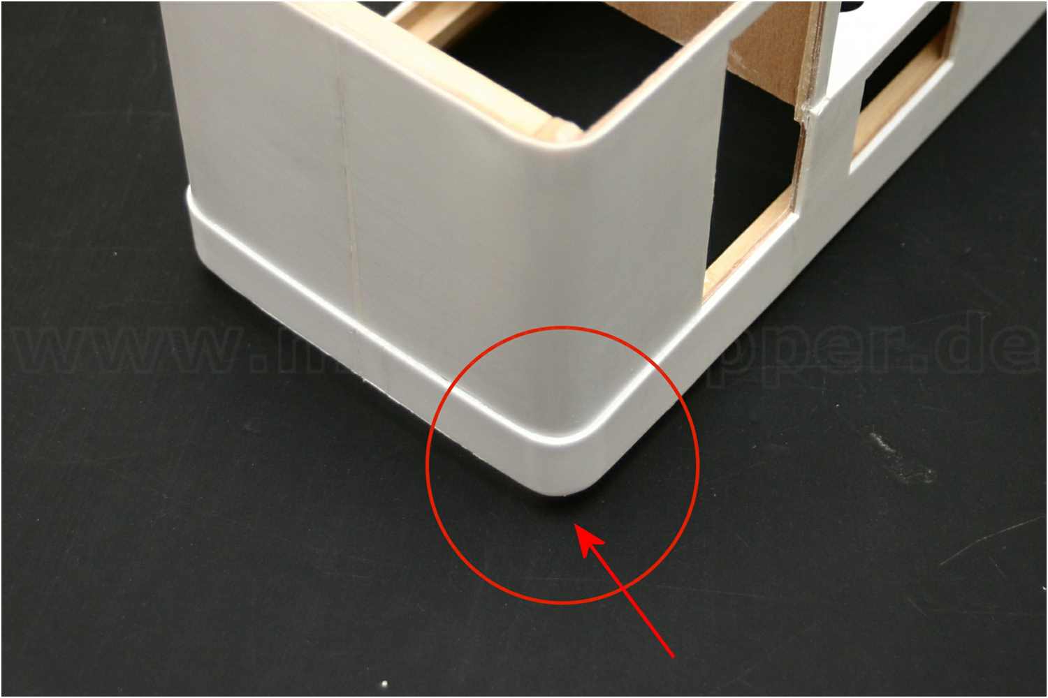 War es noch problemlos möglich am Steuerhaus selber die 0,5 mm Polystyrolplatten um die Ecken zu biegen, ist das beim Sockel mit 1,5 mm dicken Platten bei diesem recht engen Radius nicht mehr möglich. Das Material erhält eher einen unschönen Knick.